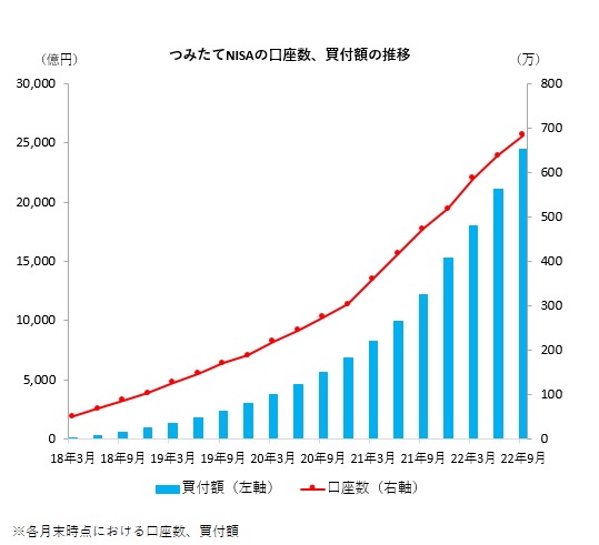 金融庁が12日に公表した「NISA・ジュニアNISA口座の利用状況調査」(2022年9月末時点)によると、2022年9月末時点で、つみたてNISAの口座数及び口座における買付額は、いずれも前四半期末(2022年6月末)比での増加が続いた。金融庁は四半期ごとにNISAの開設・利用状況調査を実施し、公表している。 2022年9月末時点のつみたてNISAの口座数は前四半期末比7.2%増の約684万口座、買付額は同16.2%増の約2兆4476億円(18〜22年の利用枠で買付があった金額の合計)となり、買付額は2ケタの伸びが継続した。口座数、買付額ともに全世代で前四半期末から増加し、買付額は20歳代の18.9%増など全世代で2ケタの伸びとなった。 一般NISAの2022年9月末時点の口座数は前四半期末比0.4%増の約1069万口座、買付額は同2.2%増の約26兆4951億円(14〜22年の利用枠で買付があった金額の合計)となった。 2021年9月末時点との比較では、口座数は一般NISAで13.8%減となったが、つみたてNISAは44.8%増、買付額は一般NISAで13.7%増、つみたてNISAは101.2%増(約2.0倍)となった。