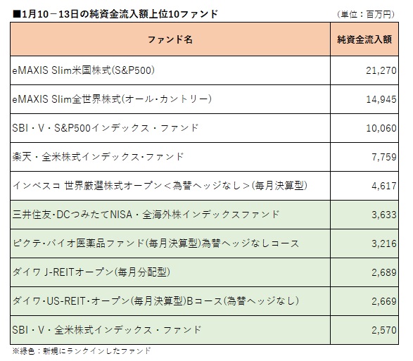 国内公募追加型株式投信(確定拠出年金専用、ファンドラップ専用、及びETF除く)を対象として、ウエルスアドバイザー推計値に基づいて先週(2023年1月10−13日)の純資金流入額上位10ファンドを確認したところ、5ファンドが返り咲いた。また、4ファンドが米国株式に投資するインデックスファンドとなった。 先週返り咲いた5ファンドは、10月3−7日以来の「SBI・V・全米株式インデックス・ファンド」(愛称:SBI・V・全米株式)、11月14−18日以来の「ダイワ・US−REIT・オープン(毎月決算型)Bコース(為替ヘッジなし)」、12月12−16日以来の「三井住友・DCつみたてNISA・全海外株インデックスファンド」と「ダイワ J−REITオープン(毎月分配型)」、12月26−30日以来の「ピクテ・バイオ医薬品ファンド(毎月決算型)為替ヘッジなしコース」。 「SBI・V・全米株式インデックス・ファンド」の返り咲きにより、3週連続純資金流入額トップの「eMAXIS Slim米国株式(S&P500)」を始め先々週(2023年1月4−6日)に続いてランクインした「SBI・V・S&P500インデックス・ファンド」(愛称:SBI・V・S&P500)、「楽天・全米株式インデックス・ファンド」(愛称:楽天・VTI)と合わせて4ファンドが米国株式に投資するインデックスファンドとなった。先週の米国株式は、FRB(米連邦準備制度理事会)が利上げペースを減速させるとの見方から続伸した。 「eMAXIS Slim全世界株式(オール・カントリー)」と「インベスコ 世界厳選株式オープン<為替ヘッジなし>(毎月決算型)」(愛称:世界のベスト)も先々週に続いてのランクインとなった。 一方、先々週トップ10入りしたファンドのうち、「日経225ノーロードオープン」、「eMAXIS Slim先進国株式インデックス」、「楽天・全世界株式インデックス・ファンド」(愛称:楽天・VT)、「キャピタル 世界株式ファンド」、「新光 US−REITオープン」(愛称:ゼウス)がトップ10圏外となった。
