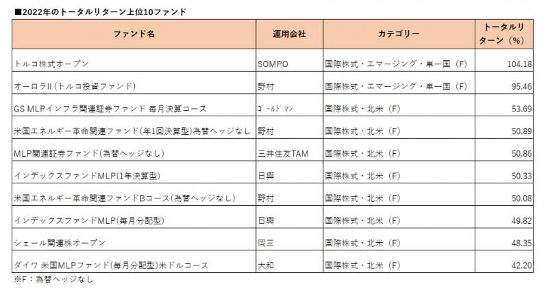 2022年の個別ファンドのトータルリターンを見たところ、SOMPOアセットマネジメントの「トルコ株式オープン」(愛称:メルハバ)がトップとなるなど、トルコ株式とエネルギー関連分野に投資する国際株式型のファンドが上位を独占した。集計は、国内公募追加型株式投信(確定拠出年金専用、ファンドラップ専用、ETF除く)から通貨選択型及びブル・ベア型を除く2022年12月末時点の純資産残高が10億円以上のファンドを対象とした。 「トルコ株式オープン」のトータルリターンは104.18%。第2位には野村アセットマネジメントの「オーロラII (トルコ投資ファンド)」が95.46%で続いた。トルコの代表的な株価指数である「イスタンブール100」は2022年に前年末比196.57%(約3.0倍)上昇した。世界的な株安に見舞われた中でトルコ株式が急騰した背景には、高インフレを受けて、同国の投資家の資金がインフレ対策や資産防衛目的から株式に向かったことがあると見られる。 第3位には、ゴールドマン・サックス・アセット・マネジメントの「GS MLPインフラ関連証券ファンド 毎月決算コース」(愛称:ザ・シェール)が入った。以下、第10位までシェールやMLP(マスター・リミテッド・パートナーシップ)など原油価格動向の影響を受けやすいファンドが並んだ。2022年のNY原油市場でWTI原油先物価格は前年末比6.71%上昇した。ロシアのウクライナ侵攻を受けて3月上旬に急騰した後6月にかけて高止まりした。年後半は伸び悩んだものの、55.01%上昇と急騰した2021年に続いて上昇した。 なお、11位以下には、エネルギー関連ファンドと並んで、「フランクリン・テンプルトン・ブラジル高配当株ファンド(毎月分配型)」(トータルリターンは33.61%)などブラジルの株式や債券に投資するファンドが並んだ。ブラジルの代表的な株価指数であるボベスパ指数は2022年に前年末比4.69%上昇した。 トルコでは足元で景気に減速感が見られる。原油については世界経済減速に伴う需要低迷懸念がある。ブラジルは今月発足した左派ルラ政権の政策運営に振らされやすい状況にある。2022年のリターン上位ファンドを取り巻く環境が変化しつつある点には留意したい。