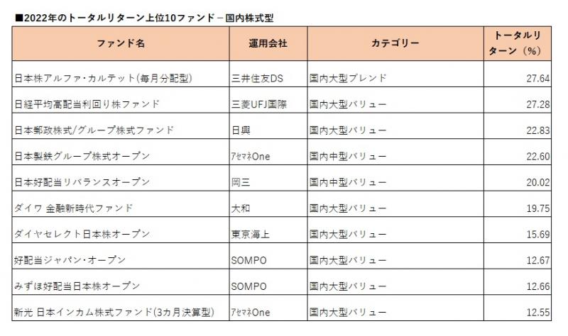 国内公募追加型株式投信(確定拠出年金専用、ファンドラップ専用、ETF、通貨選択型除く)のうち2022年12月末時点の純資産残高が10億円以上の国内株式型ファンドを対象として、2022年のトータルリターンを見たところ、上位10ファンド中9ファンドを割安株に投資するバリュー株ファンドが占めた。世界的な株安が日本にも波及する中で、バリュー株ファンドの相対的な下値抵抗力の強さが示された。 2022年は、主要各国の金融引き締めなどを受けて世界的な株安に見舞われ、日本を除く先進国の株価動向を示す「MSCI コクサイ(ワールド除く日本)インデックス(米ドルベース)」は前年末比19.53%、新興国の株価動向を示す「MSCI エマージング・マーケット・インデックス(米ドルベース)」は同22.37%下落した。日本株も下落したが、「TOPIX(東証株価指数)」の下落率が5.05%に留まるなど、相対的な底堅さが見られた。 日本株の底堅さを支えたのがバリュー株だ。ウエルスアドバイザーでは、国内株式型ファンドを、「大型・中型・小型」の規模と、「グロース・ブレンド・バリュー」のスタイルにより9つのカテゴリーに分類している。2022年のカテゴリー別平均リターンを見ると、大型・中型・小型のブレンドとグロースの6カテゴリーがマイナスとなった一方、バリューは大中小の3カテゴリー全てでプラスのリターンとなった。大型株で見ると、「国内大型ブレンド」が▲2.09%、「国内大型グロース」が▲9.67%となったのに対して、「国内大型バリュー」は8.06%のプラスリターンとなった。 また、「TOPIX(配当込み)」との月次リターンを比較すると、「国内大型バリュー」は全12カ月中10カ月で上回った。「国内大型ブレンド」が上回ったのは6カ月、「国内大型グロース」は5カ月であった。このうち、「TOPIX(配当込み)」が下落した6カ月について見ると、「国内大型バリュー」は全6カ月で上回った。「国内大型ブレンド」は3カ月で上回ったが、「国内大型グロース」は全6カ月で下回った。主要各国の利上げを受けてグロース株に逆風が吹く一方、バリュー株は下落局面での下値抵抗力を発揮した。 トップ10入りしたバリュー株9ファンドのうち、「日経平均高配当利回り株ファンド」や「日本好配当リバランスオープン」など5ファンドを高配当利回り銘柄に投資するファンドが占めた。相対的に高いインカム収入がリターンの支えになった。 なお、リターントップは「国内大型ブレンド」に属する「日本株アルファ・カルテット(毎月分配型)」。同ファンドは、国内株式への投資に、「高金利通貨戦略」、「株式カバードコール戦略」、「通貨カバードコール戦略」を組み合わせる。2022年の年間のトータルリターンは27.64%であった。