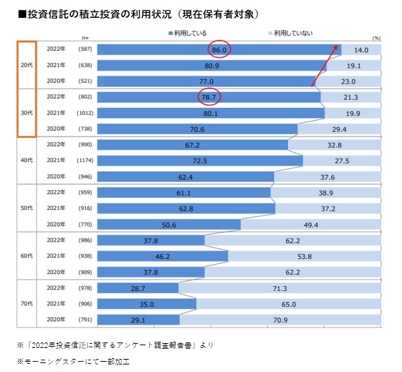 投資信託協会が17日に公表した「2022年投資信託に関するアンケート調査報告書」によると、20代、30代の投資信託保有者で「積立投資」の利用率が高く、20代で前回調査(2021年)から大きく伸びたことが分かった。 同調査は、全国の20〜79歳の男女を対象にしたインターネットによる調査。投資信託の保有状況や特徴認知、満足度、積立投資の認知などを把握すると同時に、投資信託保有未経験者にはその理由や購入検討のきっかけを確認することで、今後の投資信託の利用拡大や啓発普及活動に役立てることを目的とする。2022年9月14〜21日に実施し、総計2万人の回答を得た。 まず、現在投資信託を保有している人の割合を見ると26.5%と前回の27.9%から1.4ポイント減少した。年代別で見ると、40代以下で減少し、20代24.6%→22.5%、30代33.2%→26.8%、40代29.5%→25.2%となった。 現在投資信託を保有している人について積立投資を利用している人の割合を見ると、57.4%と前回の62.7%から5.3ポイント減少した。30代以上が前回から減少したが、その中にあって20代だけは86.0%と前回の80.9%から5.1ポイント増加した。30代は78.7%と前回の80.1%から減少したものの水準は高く、若年層では積立投資の利用率が高い。 現在の投信保有者及び保有経験者の投資信託の購入目的では、「老後の生活資金」が前回比0.1ポイント増の54.6%でトップとなった。年代別では、20代(前回38.8%→41.3%)、50代(同56.3%→59.3%)、60代(同56.6%→60.2%)、70代(同54.7→55.3%)が増加した。人生100年時代において、就職などを機に老後生活を意識し始める20代、老後が迫る50代、60代という構図が見える。 現在の投信保有者の保有口座では「特定口座もしくは一般口座など通常の課税口座」が前回比0.9ポイント増の63.5%でトップ。「NISA」が同3.0ポイント増の38.1%で第2位となった。NISAは全年代で前回から増加した。「つみたてNISA」は同3.2ポイント減の32.0%で第3位となった。40代以上で前回から減少したためだが、20代は前回の61.3%から65.6%へ、30代は54.5%から55.5%へ増加した。20代はiDeCo(個人型確定拠出年金)も前回の16.0%から19.4%へ、企業型DC(企業型確定拠出年金)も同14.4%から16.4%へ増加した。 現在の投信保有者については、若年層、特に20代で、老後生活への備えとして、積立投資への意識が高まっている。一方、若年層で非保有の割合が増加した。若年層に向けて、人生100年時代における資産運用の重要性や積立投資の効用などを、より積極的に訴えていくことが求められよう。