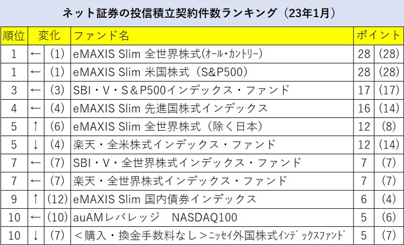 大手ネット証券3社の投信積立契約件数ランキング(月次)2023年1月のトップは同ポイントで「eMAXIS Slim 全世界株式(オール・カントリー)」、「eMAXIS Slim 米国株式(S&P500)」になった。第3位は「SBI・V・S&P500インデックス・ファンド」で、前月と同じ結果だった。トップ10には前月から新興国株式を含む全世界株式を対象としたインデックスファンドが目立ってきているが、今月は「eMAXIS Slim 全世界株式(除く日本)」が前月の6位から5位にランクアップし、前月から強まった全世界株式を中心とした積立投資の傾向が一段と強まったようだ。 ランキングは、定期的に月次の投信積立契約件数トップ10を公表しているSBI証券、楽天証券、マネックス証券の公開情報を使用。各社ランキング1位に10点、以下、順位が落ちるたびに1点を減点し、第10位を1点として、3社のランキング10位までのファンドの点数を集計した。 「eMAXIS Slim 全世界株式(オール・カントリー)」のトップに続き、「eMAXIS Slim 全世界株式(除く日本)」が前月から獲得ポイントを4ポイント上げて第5位にランクアップした。前月同様に第7位には「SBI・V・全世界株式インデックス・ファンド」と「楽天・全世界株式インデックス・ファンド」が入り、前月同様にトップ10のうち4本を全世界株式を対象としたインデックスファンドが占めている。昨年までは、「eMAXIS Slim 米国株式(S&P500)」を中心に、米国株式を投資対象としたインデックスファンドが投信積立の主流だったことと比べると、グローバル株式に投資する投資範囲が横に広がって分散されてきたことが感じられる。 一方、米国株式については根強い人気がある。ランキングの第10位には、前月と同様に「auAMレバレッジ NASDAQ100」が入っている。同ファンドは、米国の「NASDAQ100指数(米ドルベース)」の値動きの2倍程度の値動きをめざすファンドで、2021年頃に人気を集めた「レバナス」という投資手法のファンドだ。米国成長株の代表的な指数である「NASDAQ100」は、米国の急速な利上げによって経済の過熱感が強く意識され、それとともに株価の割高感が指摘されるようになったことから下落した。それでも、レバレッジをかけて(大きなリスクをとって)米国NASDAQに投資することを選択する投資家が少なくないということだ。 「NASDAQ100」は2020年3月に7000ポイント割れの水準だったが2021年11月には1万6500ポイントを超えた。そこをピークに2022年11月には10000ポイント程度に下落したものの、現在は1万2800ポイント台にまで回復してきている。「auAMレバレッジ NASDAQ100」の信託報酬率は年0.43%で、レバナス型ファンドの主流だった「iFreeレバレッジ NASDAQ100」の信託報酬率(0.99%)の半分以下になっている。 なお、「eMAXIS Slim 国内債券インデックス」がランキング圏外から第9位にジャンプアップしてきた。国内債券は超低金利政策が継続してきた関係で価格の上昇余地が無いような状況が続いてきた。また、日銀は2016年1月に「マイナス金利政策」に踏み切った後、16年9月から長期金利の利回りを抑制する「イールドカーブコントロール(YCC)」を実施し、10年国債利回りの上限0.25%を維持してきたため、債券価格は経済環境の変動を横目に概ね横ばいの推移となってきた。ただ、2022年になって世界的なインフレが国内にも波及する動きになると、YCCの範囲から外れた超長期国債の利回りが上昇(価格下落)し、同ファンドの基準価額も値下がり傾向が強まった。そして、2022年12月に日銀がYCCの枠組みを変更し、0.25%の上限を0.5%に引き上げたため、10年国債価格は急落した。その結果として、同ファンドの22年12月末現在のトータルリターンはマイナス5.34%となり、過去5年の年率リターンもマイナス0.88%になっている。今後も一段と利上げ(債券価格にとっては下落圧力)が予想されている中、なぜ、積立投資の対象として選ばれているのか、理解が難しい動きになっている。
