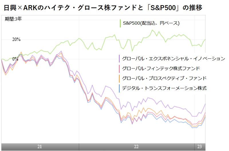 テクノロジーがもたらす将来の大きな成長期待について、俄かには確信できない場合は、コツコツと少額で積立投資をしていくという方法もある。世の中の一部には、「ハイテク・グロース株は、2021年末までに余りにも株価が上昇し過ぎた。これからは、グロース株ではなくバリュー株の時代だ」という意見もある。長らく物色の流れから外れていたバリュー株の中には、依然魅力的な株価の位置にある銘柄が少なくないことも事実だろう。どのグロース株が今後も持続的に成長が可能なのか、どのバリュー株が真に価値のある企業なのかということについては、足元の株価の動きや位置だけをみていてわかるものではない。それぞれの企業の経営方針や人材の質、テクノロジーの評価や財務、資産の評価など、企業を多角的に分析して理解することによってはじめて、その価値がわかるというものだ。2022年に世界的な株安を経験し、その出直りのタイミングを待つ今、どの運用会社の、どのファンドが頼りになるのか、改めて考える時期を迎えているといえるだろう。(グラフは、日興×ARKのハイテク・グロース株ファンドと「S&P500」指数の推移)
