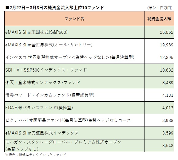 国内公募追加型株式投信(確定拠出年金専用、ファンドラップ専用、及びETF除く)を対象として、弊社推計値に基づいて先週(2023年2月27日−3月3日)の純資金流入額上位10ファンドを確認したところ、新規設定の「FDA日米バランスファンド(積極型)」(愛称:みどりの架け橋・積極型)のほか、米国株式インデックスファンドの返り咲きなど、合計6ファンドが新規にランクインした。 先週の純資金流入額トップは「eMAXIS Slim米国株式(S&P500)」。266億円の純資金流入となり、2月13−17日以来2週ぶりにランクインすると同時に、2月6−10日以来3週ぶりのトップとなった。「楽天・全米株式インデックス・ファンド」(愛称:楽天・VTI)も2週ぶりにランクイン。「SBI・V・S&P500インデックス・ファンド」(愛称:SBI・V・S&P500)も1月30−2月3日以来4週ぶりにランクインしており、米国株式に投資する主要な低コストインデックスファンドがトップ10内に返り咲いた。「eMAXIS Slim先進国株式インデックス」も4週ぶりに返り咲いた。先々週の米国株式は反発し、S&P500は前週末比1.90%上昇した。 このほかには、上記「FDA日米バランスファンド(積極型)」のほか、2022年以降で初めてのランクインとなる「モルガン・スタンレーグローバル・プレミアム株式オープン(為替ヘッジなし)」が新規にランクインした。 「FDA日米バランスファンド(積極型)」は2月27日の設定。日米ETFへの投資を通じて、実質的に日米の株式と国債に分散投資する。2023年2月時点の基本投資配分比率は、日本株式と米国株式に40%ずつ、日本国債と米国国債に10%ずつとなっている。 「モルガン・スタンレーグローバル・プレミアム株式オープン(為替ヘッジなし)」は実質的に日本を含む世界各国のプレミアム企業の株式に投資する。プレミアム企業とは、高いブランド力や有力な特許、強固な販売網などの競争力を背景に、持続的にフリー・キャッシュフローを増大させることが見込まれる企業としている。2023年1月末時点の組入上位3銘柄は、米『マイクロソフト』(組入比率9.0%)、米『フィリップ・モリス・インターナショナル』(同7.5%)、米『ビザ』(6.6%)となっている。 先々週(2023年2月20−24日)に続いてランクインしたのは、「eMAXIS Slim全世界株式(オール・カントリー)」、「インベスコ 世界厳選株式オープン<為替ヘッジなし>(毎月決算型)」(愛称:世界のベスト)、「債券パワード・インカムファンド(資産成長型)」(愛称:パワード・インカム)、「ピクテ・バイオ医薬品ファンド(毎月決算型)為替ヘッジなしコース」の4ファンド。 一方、先々週トップ10入りしていたファンドのうち、「日経225ノーロードオープン」、「ダイワ・US−REIT・オープン(毎月決算型)Bコース(為替ヘッジなし)」、「楽天 日本株4.3倍ブル」、「フィデリティ・USハイ・イールド・ファンド」、「パインブリッジ・キャピタル証券ファンド(為替ヘッジあり)」、「ノムラ・ジャパン・オープン」がトップ10圏外となった。
