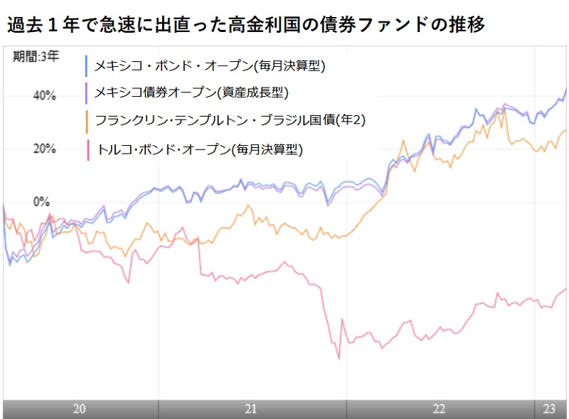 政策金利が2ケタになるような高金利の債券に投資するファンドのパフォーマンスが好調だ。2023年2月末現在の国際債券型のファンドで過去1年間のパフォーマンスランキング(通貨選択型除く)をみると、「トルコ・ボンド・オープン(毎月決算型)」の39.04%、「メキシコ債券オープン(資産成長型)『愛称:アミーゴ』」の33.51%、「メキシコ・ボンド・オープン(毎月決算型)」の30.54%、「フランクリン・テンプルトン・ブラジル国債(年2回決算型)」の29.22%など、非常に大きな値上がりが確認できる。トルコ、メキシコ、ブラジルというと、簡単には手を出しづらい国々であるが、向こう1年の間には米国等の利上げがピークを迎えて、金利低下へと転換することも期待されるタイミングとなっているだけに、多少の値動きの荒さを覚悟して、これら高金利の国々に投資する債券ファンドをポートフォリオの一部に持つことも検討してみたい。 トルコは、ロシアとウクライナの戦争の停戦に向けた仲介役を担おうとしたり、2月に発生した大地震によって注目を集めたが、経済環境は非常に厳しい国として知られている。エルドアン大統領が中央銀行の政策に介入し、過度な金融緩和策を継続させたことによって通貨(トルコ・リラ)が急落し、急激なインフレに苦しんでいる。2022年1月のCPI(消費者物価指数)上昇率は前年同月比プラス57.7%と22年12月のプラス64.27%から低下したとはいえ異常な水準になっているが、同国の政策金利は9%に据え置かれている。 エルドアン大統領の主張は「利下げがインフレを抑制する」という常識外れのもので、インフレが多少とも低下したことを受けて追加利下げを要求している。このような大統領が中銀総裁の任命権によって金融政策をゆがめてきたため、世界の投資家の資金がトルコから流出する事態になってしまっている。たとえば、トルコ中銀によるとトルコ国債の外国人保有高はエルドアン大統領が就任する前の2013年に720億ドル相当だったものが、2023年3月には14億ドル相当でしかないという。トルコでは、今年5月に大統領選挙が予定され、エルドアン大統領が失脚する可能性も示唆され、それによってトルコ経済が改善に向かうという期待もあるが、選挙の結果は予測が難しく、選挙が近づくにつれて現職であるエルドアン大統領が、一段と強硬な金融緩和圧力をかける可能性もあるなど、不安定な市場が続くとみられている。 メキシコは、高いインフレ率に悩まされ、2023年2月に政策金利を10.5%から11%に引き上げたものの、依然としてインフレ率は8%近い水準にあり、利上げの途上にあるとみられている。このため、2022年は経済成長率が3%だったところから、23年は1%程度に減速するものと考えられている。これは、利上げによる経済への圧迫効果だけでなく、輸出の87.9%を依存する米国経済が一段と減速すると予測されることから外需の鈍化が見通されるためだ。 ブラジルは政策金利が13.75%という非常に高い水準にあり、ブラジル中央銀行(BCB)はこの金利水準を長期に据え置くと表明している。このBCBの金融政策に対してはルラ大統領は一貫して批判的な立場を取り、中央銀行と政権との対立が金融の不安定要素になっている。また、ルラ大統領は政権発足後に、ばらまき型の政策運営によって財政を圧迫しており、この状態が続くことになればブラジル国債等の信用問題に発展する可能性もある。 このように、過去1年間のパフォーマンスが良かった3カ国の現状は、簡単に見てわかるだけでも問題や課題を抱えていることは明らかだ。ただ、エルドアン大統領が選挙で敗れるようなことがあれば、トルコはエルドアン氏が首相時代から20年間にわたって続いてきた政策が大転換することが考えられる。また、メキシコも米国の景気減速が軽微に終わった場合は、金利引き下げへの転換も早まると期待できる。ブラジルもルラ大統領がかつて政権を担っていた時の経験に照らして財政規律の重要性を考えた政策運営に転じるという期待がある。3カ国が抱える不透明要素は、プラスに転じる可能性もある状況だ。 したがって、債券ファンドといえども一括して大きな資金を投じるのではなく、毎月積立など時間分散を行った投資をしていけば、多少の波乱があっても次の展開に備えられるだろう。何より、各国の政策金利の水準からわかる通り、投資している債券の利回りは10%前後という非常に高い水準にある。急激なインフレによって日本を除く世界の金利が急上昇した2022年以降の債券市場にとっての大きな逆風を潜り抜け、高い水準の金利が得られるようになった債券に投資するファンドに注目していきたい。(グラフは、高金利の新興国の債券に投資するファンドの過去3年間のトータルリターン推移)