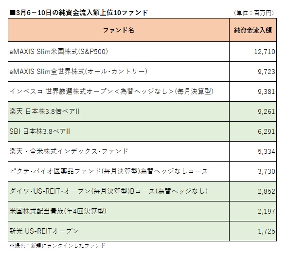 国内公募追加型株式投信(確定拠出年金専用、ファンドラップ専用、及びETF除く)を対象として、弊社推計値に基づいて先週(2023年3月6−10日)の純資金流入額上位10ファンドを確認したところ、「eMAXIS Slim米国株式(S&P500)」が2週連続のトップとなったほか、5ファンドが新規にランクインした。 「eMAXIS Slim米国株式(S&P500)」は127億円の純資金流入となった。同ファンドのほかには、「eMAXIS Slim全世界株式(オール・カントリー)」、「インベスコ 世界厳選株式オープン<為替ヘッジなし>(毎月決算型)」(愛称:世界のベスト)、「楽天・全米株式インデックス・ファンド」(愛称:楽天・VTI)、「ピクテ・バイオ医薬品ファンド(毎月決算型)為替ヘッジなしコース」が先々週(2023年2月27日−3月3日)に続いてトップ10入りした。 先週新規にランクインした5ファンドは、「楽天 日本株3.8倍ベアII」、「SBI 日本株3.8ベアII」、「ダイワ・US−REIT・オープン(毎月決算型)Bコース(為替ヘッジなし)」、「米国株式配当貴族(年4回決算型)」、「新光 US−REITオープン」(愛称:ゼウス)。「楽天 日本株3.8倍ベアII」、は1月23−27日以来、「ダイワ・US−REIT・オープン(毎月決算型)Bコース(為替ヘッジなし)」は2月20−24日以来、「新光 US−REITオープン」は2月6−10日以来のランクイン。「SBI 日本株3.8ベアII」は設定(2022年10月4日)来初、「米国株式配当貴族(年4回決算型)」は2022年以降で見て初のランクインとなった。 一方、先々週トップ10入りしていたファンドのうち、「SBI・V・S&P500インデックス・ファンド」、(愛称:SBI・V・S&P500)、「債券パワード・インカムファンド(資産成長型)」(愛称:パワード・インカム)、「FDA日米バランスファンド(積極型)」(愛称:みどりの架け橋・積極型)、「eMAXIS Slim先進国株式インデックス」、「モルガン・スタンレーグローバル・プレミアム株式オープン(為替ヘッジなし)」がトップ10圏外となった。
