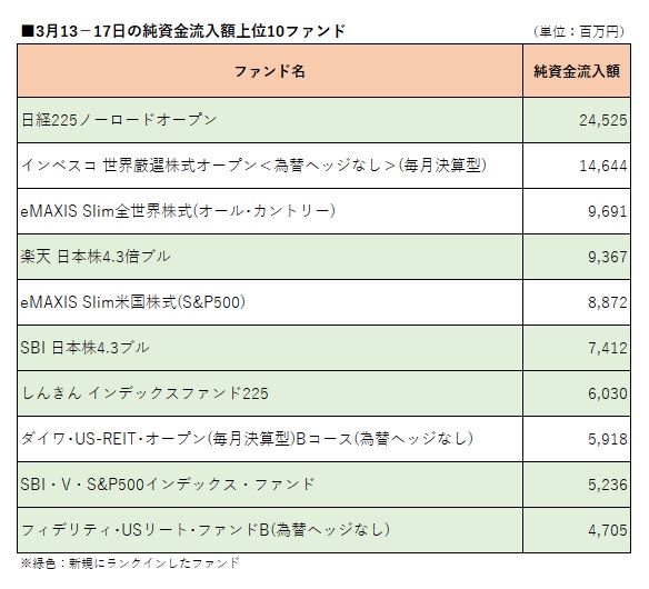 国内公募追加型株式投信(確定拠出年金専用、ファンドラップ専用、及びETF除く)を対象として、弊社推計値に基づいて先週(2023年3月13−17日)の純資金流入額上位10ファンドを確認したところ、「日経225ノーロードオープン」が約3カ月ぶりのトップとなったほか、同ファンドを含む6ファンドがトップ10内に返り咲いた。 「日経225ノーロードオープン」は245億円の純資金流入となった。2月20−24日以来3週ぶりにランクインし、2022年12月19−23日以来約3カ月ぶりのトップとなった。先週の国内株式は急反落し、日経平均株価は前週末比2.88%下落した。米国での相次ぐ銀行の破綻を受けて世界の金融システムの混乱を警戒する動きが強まった。国内株式が急落する中で、同ファンドには戻りを見込んだ資金が流入したもようだ。同ファンドと同じく2022年12月19−23日以来のランクインとなった「SBI 日本株4.3ブル」と「しんきん インデックスファンド225」、2月20−24日以来3週ぶりのランクインとなった「楽天 日本株4.3倍ブル」も国内株式の戻りを見込んだ資金が向かったと見られる。 これら4ファンドのほかには、「SBI・V・S&P500インデックス・ファンド」(愛称:SBI・V・S&P500)、「フィデリティ・USリート・ファンドB(為替ヘッジなし)」がトップ10内に返り咲いた。順に、2月27日−3月3日以来2週ぶり、2月13−17日以来4週ぶりのランクインとなった。 先々週に続いてランクインしたのは、「インベスコ 世界厳選株式オープン<為替ヘッジなし>(毎月決算型)」(愛称:世界のベスト)、「eMAXIS Slim全世界株式(オール・カントリー)」、「eMAXIS Slim米国株式(S&P500)」、「ダイワ・US−REIT・オープン(毎月決算型)Bコース(為替ヘッジなし)」の4ファンド。 一方、先々週トップ10入りしていたファンドのうち、「楽天 日本株3.8倍ベアII」、「SBI 日本株3.8ベアII」、「楽天・全米株式インデックス・ファンド」(愛称:楽天・VTI)、「ピクテ・バイオ医薬品ファンド(毎月決算型)為替ヘッジなしコース」、「米国株式配当貴族(年4回決算型)」、「新光 US−REITオープン」(愛称:ゼウス)がトップ10圏外となった。