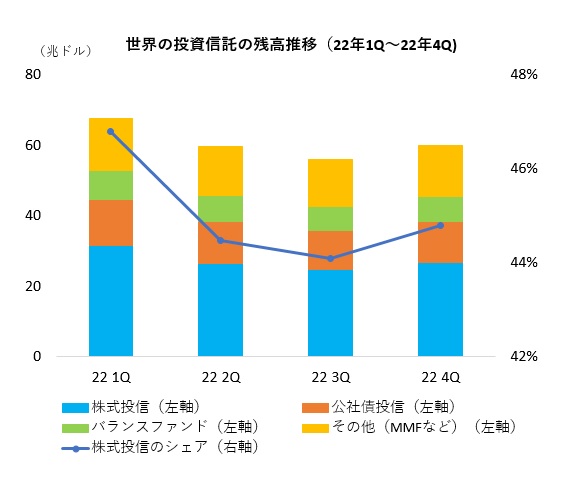 投資信託協会が先日公表した「投資信託の世界統計2022年第4四半期(10月〜12月)」によると、同四半期末の投資信託(株式投信、公社債投信、バランスファンド、MMFなどの合計)の純資産残高は前四半期(2022年第3四半期)末比7.1%増の60兆1480億ドルとなった。同四半期は、10〜11月にかけて米FRB(米連邦準備制度理事会)が利上げペースを減速させるとの見方が広がったことから世界的な株高となり、投資信託の残高は4四半期ぶりに増加した。同統計は、国際投資信託協会(IIFA)が46の国・地域から提供されたデータを集計したものである。 株式投信の純資産残高は前四半期末比8.8%増の26兆9480億ドル、公社債投信の純資産残高は同2.6%増の11兆5490億ドル、バランスファンドは同7.7%増の7兆940億ドルとなり、いずれも4四半期ぶりに増加した。第4四半期末時点の投信全体の残高に占めるシェアは、株式投信44.8%、公社債投信19.2%、バランスファンド11.8%となった。 第4四半期は投信全体で1230億ドルの純資金流入(第3四半期は390億ドルの純資金流出)と3四半期ぶりの純資金流入となった。ただし、MMFが3320億ドルの純資金流入(同170億ドルの純資金流入)となったことが大きく、株式投信は530億ドルの純資金流出(同790億ドルの純資金流出)、公社債投信は1250億ドルの純資金流出(同420億ドルの純資金流入)、バランスファンドは460億ドルの純資金流出(同470億ドルの純資金流出)となった。 第4四半期は、世界の株価動向を示す「MSCIオール・カントリー・ワールド・インデックス」が前四半期末比9.40%上昇(第3四半期は同7.27%下落)し、米国株式市場ではNYダウが同15.39%上昇(同6.66%下落)した。債券は、2022年12月末の米10年債利回りが3.87%と同年9月末の3.83%から上昇(債券価格は下落)した。一時4.2%台を付けた。