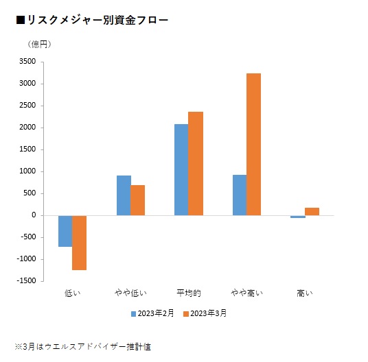 ウエルスアドバイザーのリスクメジャー別資金フローを見ると、2023年3月は相対的にリスクの高いファンドへの資金流入が目立った。同月は、欧米の金融システム不安に揺れたが、投資家はリスク選好スタンスを強めたもようだ。 リスクメジャーは、運用期間3年以上の国内ファンドについて、ファンドのリスク(標準偏差)が全ファンド中でどの水準にあるのかを、「低い」、「やや低い」、「平均的」、「やや高い」、「高い」の5段階で示したものである。 2023年3月は、リスクメジャー付与全ファンドの純資金流入額(ウエルスアドバイザー推計値を使用)が前月比66.8%増の5190億円と、3カ月ぶりに前月を上回った。けん引役は「やや高い」で、同区分に属するファンドの純資金流入額の合計は前月比約3.6倍の3233億円と急増した。「高い」も168億円の純資金流入となり、3カ月ぶりの純資金流入となった。 一方で、「低い」は1242億円の純資金流出と4カ月連続の流出超過となり、流出超過額は前月から526億円増加。「やや低い」は678億円の純資金流入となったが、流入超過額は前月比24.2%減となった。 2023年3月の世界株式は上昇した。米銀破綻をきっかけに欧米の金融システムに対する不安が高まり一時急落したが、当局の迅速な対応で不安が和らぎ回復した。安心感に加えて、金融不安の中で利上げの一時停止観測が広がったことから、投資家はリスク選好スタンスを回復したと見られる。 「やや高い」に属するファンド(確定拠出年金専用、ファンドラップ専用、ETF除く)について、2023年3月の純資金流入額上位を見ると、「eMAXIS Slim米国株式(S&P500)」、「SBI・V・S&P500インデックス・ファンド」(愛称:SBI・V・S&P500)、「楽天・全米株式インデックス・ファンド」(愛称:楽天・VTI)といった米国株式インデックスファンドや、「インベスコ 世界厳選株式オープン<為替ヘッジなし>(毎月決算型)」(愛称:世界のベスト)などが並んだ。いずれも月次の純資金流入額上位ランキングの常連ファンドであり、前月から流入超過額が増加した。 「低い」に属するファンドについて、2023年3月の純資金流出額上位を見ると、カテゴリー「安定」と「国内債券・中長期債」に属するファンドが並んだ。安全資産とされる国内債券に投資するファンドからの資金流出には、リスク回避スタンスの後退に加えて、今月の日銀新総裁の就任を受けて金融政策修正による金利上昇懸念が影響していると考えられる。「安定」はバランス型ファンドのカテゴリーの中で、リスク性資産(株式+REIT)の比率が最も低いタイプである。同カテゴリーに属するファンドから資金流出が目立つことは、投資家のリスク選好の裏返しとも見られる。