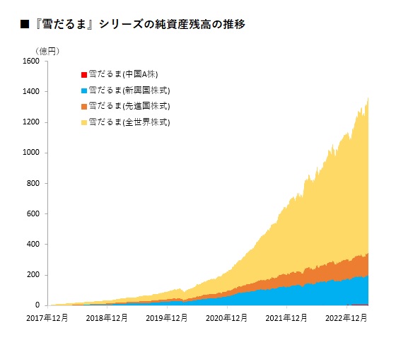 SBIアセットマネジメントが運用する「SBI・全世界株式インデックス・ファンド」(愛称:雪だるま(全世界株式))の純資産残高が17日に1000億円に到達した。全世界の株式に分散投資できる低コストインデックスファンドとして、設定来資金流入が続いている。 同ファンドは、低コストインデックスファンド『雪だるま』シリーズのうちの1つ。シリーズは同ファンドのほか、「新興国株式」、「先進国株式」、「中国A株」の4ファンドからなる。 同ファンドは、「FTSE グローバル・オールキャップ・インデックス(円換算ベース)」をベンチマークとする。同インデックスは、全世界の大型株、中型株だけではなく、小型株も含めた約9500銘柄で構成されており、同インデックスをベンチマークとする同ファンドも実質的に、小型株を含めた全世界の株式に幅広く分散投資することが出来る。 同ファンドの信託報酬等(税込み)は、投資先ETFの信託報酬を含めた実質で年0.1102%程度。全世界の株式に投資するインデックスファンド(確定拠出年金専用、ファンドラップ専用、ETF除く)の中では最安である。また、つみたてNISA対象ファンドでもある。 同ファンドの純資金流出入額の推移を見ると、2017年12月の設定から2023年3月まで64カ月連続で純資金流入となっている。月々の純資金流入額は増加基調にあり、2023年3月の純資金流入額は約41.9億円と2022年12月の約41.6億円を更新して、設定来で最大となった。小型株も含めた全世界の株式に低コストで手軽に分散投資できる点が投資家の資金を集めている。