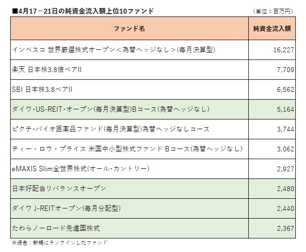 国内公募追加型株式投信(確定拠出年金専用、ファンドラップ専用、及びETF除く)を対象として、ウエルスアドバイザー推計値に基づいて先週(2023年4月17−21日)の純資金流入額上位10ファンドを確認したところ、「インベスコ 世界厳選株式オープン<為替ヘッジなし>(毎月決算型)」(愛称:世界のベスト)が3週ぶりのトップとなったほか、4ファンドが新規にランクインした。 「インベスコ 世界厳選株式オープン<為替ヘッジなし>(毎月決算型)」は162億円の純資金流入。先々週(2023年4月10−14日)の3位から順位を上げ、3月27−31日以来のトップとなった。 同ファンドのほかには、「楽天 日本株3.8倍ベアII」、「SBI 日本株3.8ベアII」、「ピクテ・バイオ医薬品ファンド(毎月決算型)為替ヘッジなしコース」、「ティー・ロウ・プライス 米国中小型株式ファンド Bコース(為替ヘッジなし)」、「eMAXIS Slim全世界株式(オール・カントリー)」が先々週に続いてトップ10入りした。 先週新たにトップ10入りしたのは、「ダイワ・US−REIT・オープン(毎月決算型)Bコース(為替ヘッジなし)」、「日本好配当リバランスオープン」、「ダイワ J−REITオープン(毎月分配型)」、「たわらノーロード先進国株式」。「ダイワ・US−REIT・オープン(毎月決算型)Bコース(為替ヘッジなし)」は4月3−7日以来、「ダイワ J−REITオープン(毎月分配型)」は2月13−17日以来、「たわらノーロード先進国株式」は3月20−24日以来のランクイン。「日本好配当リバランスオープン」は2022年以降で見て初めてのランクインとなった。 「日本好配当リバランスオープン」は日経500種平均株価採用銘柄のうち、予想配当利回り上位70銘柄程度に均等に投資する。組入銘柄の見直しと組入比率の調整を月1回行い、ポートフォリオの予想配当利回りが相対的に高水準を維持するよう努める。2023年4月7日時点の組入銘柄数は71で、組入銘柄の予想平均配当利回りは4.86%となっている。 一方、先々週トップ10入りしていたファンドのうち、「eMAXIS Slim米国株式(S&P500)」、「楽天・全米株式インデックス・ファンド」(愛称:楽天・VTI)、「ティー・ロウ・プライス 米国中小型株式ファンド Aコース(為替ヘッジあり)」、「三井住友・DCつみたてNISA・全海外株インデックスファンド」がトップ10圏外となった。「eMAXIS Slim米国株式(S&P500)」は2月20−24日以来約2カ月ぶりの圏外。「楽天・全米株式インデックス・ファンド」も含め、上位常連であった米国株式インデックスファンドがトップ10圏外となった。投資家の資金フローに変化が生じているのか、今後のランキングに注目したい。