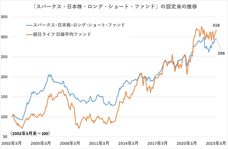同ファンドの設定来のパフォーマンスを、国内株式の代表的な株価指数である日経平均株価に連動するファンド「朝日ライフ 日経平均ファンド 『愛称 : にぃにぃGo』」の成績と比較してみると、2023年3月末現在で日経平均連動型ファンドの方がトータルリターンの結果として優れているものの、リスク調整後のリターン(リスク1単位当たりの超過リターン=シャープ・レシオ)では、「スパークス・日本株・ロング・ショート・ファンド」の方が優れていることがわかる。2023年3月末時点のトータルリターン1年は、同ファンドが7.02%に対し、「にぃにぃGO」は2.36%と「ロング・ショート」が上回るが、トータルリターン10年(年率)では、6.21%と9.86%で「にぃにぃGo」が上回っている。ただし、シャープ・レシオでは「ロング・ショート」対「にぃにぃGo」で、1年は0.89対0.15、5年で0.57対0.41、10年で0.82対0.60と、いずれの期間でも「ロング・ショート」が上回っている。「ロング・ショート」は、リスクが低いことによって、安定的にシャープ・レシオが高い運用ができている。