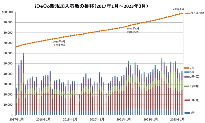 国民年金基金連合会が5月1日に発表したiDeCo(イデコ、個人型確定拠出年金)の業務状況によると3月の新規加入者数は4万2889人で加入者総数は289万9618人になった。新規加入者数は前年同月比11.5%減となり、2カ月連続で前年同月を下回り、前月よりも減少率が大きくなった。なお、従業員のiDeCoに企業が上乗せ拠出をするiDeCo+(中小事業主掛金納付制度)は、実施事業所数は5948事業所、対象従業員数は3万7154人となった。 3月の新規加入者の内訳は、第1号加入者は4491人(前月3959人)、第2号加入者は3万6410人(前月3万5437人)、第3号加入者1675は人(前月1567人)となった。前月と同様に第1号、第2号、第3号の加入が前年同月比で減少しているが、いち早く新規加入の勢いが衰えた第1号と第3号の前年同期比減少率は前月よりも小さくなるものの、第2号加入者の減少率は前月を大きく上回った。第2号加入者の中で、企業年金なしの新規加入者が2万221人(前月1万8279人)。共済組合員(公務員)の新規加入者は6486人(前月6746人)となった。第2号加入者の中で「企業年金あり」が9713人(前月1万412人)と前年同月比53.3%増と伸びているが、前月の伸び率79.3%増からは伸びが鈍った。 2022年10月1日から企業型確定拠出年金(企業型DC)加入者のiDeCo加入要件が緩和され、第2号加入者の「企業年金あり」に区分される加入者の新規加入が急速に増えてきたが、その勢いも鈍化してiDeCoへの加入意欲は全般に大きく減退した状況になっている。「企業年金あり」の新規加入者は、2022年10月に前年同期比3倍増と大きく伸び、同年11月に3.7倍増でピークを付けたものの、翌月から徐々に伸び率が鈍化した。22年12月に3倍増、23年1月に2.25倍増、同年2月に79.3%増となり、この3月は53.3%増だった。この制度改正による「企業型DCとiDeCoの併用ブーム」は一巡したようにみえる。 現在、収益非課税の資産形成支援制度としては、2024年1月からスタートする「新NISA」に関心が高まっている。現状では、1年間に40万円までしか投資ができない「つみたてNISA」が、新NISAでは「つみたて投資枠」として年間120万円(月額10万円)まで非課税枠が拡充される。「つみたてNISA」で月間3.3万円、iDeCoで月間2万円など、それぞれの限度額で制度を併用していたものを、新NISAでは、1つの制度で月額10万円までつみたて投資が可能になる。iDeCoには60歳になるまでは換金できないという制約があるため、将来のための資金を積み立てるという単純な目的のためには、いつでも換金が可能なNISAの方が利便性が高い。新NISAの話題が出るとともに、iDeCoへの関心が薄れたのは当然の反応ともいえる。 一方、iDeCoを含む確定拠出年金制度の制度改正を検討する議論が4月12日から社会保障審議会で始まった。ここで改めてiDeCoの加入要件や掛金の限度額等について議論されることになっている。iDeCoなど自助努力の年金制度は、退職後の生活に安心をもたらす制度として重要だ。iDeCoで積み立てた資金は、60歳まで引き出せないが、それは、60歳を超えて退職した後の生活で使う資金として残していくものだからだ。「老後の資金」として貯めたつもりのお金が、子どもの学資や住宅ローンの頭金などに転用されると、自身が老齢化した時に、老後の資金が足りないと困ることになりかねない。老後資金は、高齢社会の進展によって年々、自助努力の資金準備の重要性が重くなってきている。老後のためだけに目的を絞ったiDeCoの拡充は、NISAと同じく、今の日本に重要なテーマの1つといえる。今後の議論を待ちたい。(図版は、iDeCo新規加入者の推移)