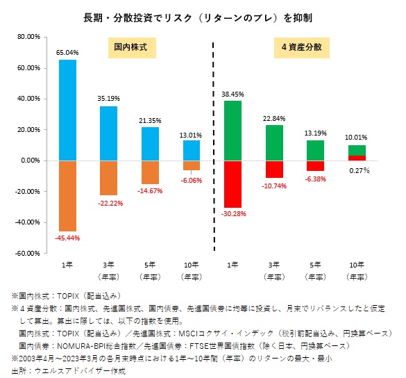 2024年から新しいNISA(少額投資非課税制度)が始まる。新しいNISAは従来のNISAに比べて、非課税保有限度額が大幅に拡大され、非課税保有期間は無期限となる。新NISAは、個人の資産形成にとってかなり有力なツールになると期待され、若年層を中心に将来に備えた資産形成を真剣に検討する好機となろう。「貯蓄から投資へ」の加速が見込まれる今こそ、投資の原則である「長期・分散・積立」を改めて確認しておきたい。 まず、長期投資について確認したい。運用期間が長くなるほどリスク(リターンのブレ)を小さくすることができる。データで見てみよう。国内株式を対象に、過去20年間(2003年4月〜2023年3月、240カ月)の各月末時点において1年間保有したリターンの推移を見ると、最大上昇率65.04%〜最大下落率▲45.44%の範囲内となった。3年間保有したリターン(年率)は35.19%〜▲22.22%の範囲内、5年間保有したリターン(年率)は21.35%〜▲14.67%の範囲内、10年間保有したリターン(年率)は13.01%〜▲6.06%の範囲内となった。保有期間が長くなるほどリターンのブレ幅(リスク)が小さくなることが分かる。 国内株式の他に、国内債券、先進国株式、先進国債券の合計4資産に均等に投資した場合ではどうだろうか。1年間保有したリターンは38.45%〜▲30.28%の範囲内、3年間保有したリターン(年率)は22.84%〜▲10.74%の範囲内、5年間保有したリターン(年率)は13.19%〜▲6.38%の範囲内、10年間保有したリターン(年率)は10.01%〜0.27%の範囲内となった。4資産分散においても、保有期間が長くなるほどリターンのブレ幅が小さくなる。さらに、1年〜10年間のいずれの期間においても、4資産分散の方が国内株式よりもリターンのブレ幅が小さい。国内株式が下落した局面で国内債券など他の資産が支えとなり、分散投資によるリスク抑制効果が表れたと言える。これらのことから、長期投資、分散投資によってリスクを抑制できることが分かる。 リスクの抑制とパフォーマンスについてのシミュレーションを見てみよう。30年前の1993年3月末時点を10000として2023年3月までのパフォーマンスを試算したところ、国内株式22476、4資産分散47672と大きな差がついた。国内株式は、1990年代のバブル崩壊や金融危機、2000年代のITバブル崩壊やリーマンショック時の落ち込みが響いて2010年代前半まで低調なパフォーマンスを余儀なくされた。これに対して、4資産分散は分散投資によるリスク抑制が奏功して下落局面での落ち込みを相対的に小幅に留めたことが支えとなり、良好なパフォーマンスとなった。 続いて、「積立投資」について確認したい。投資において頭を悩ますのは、タイミングであろう。「安く買って高く売る」ことができればよいのだが、実際は「高値掴みの安値売り」となりがちだ。値上がりしている資産を見ると追随して購入したくなり、購入後に下落すると損失拡大を嫌って売却するというのは、ある意味自然な行動である。 そこで検討したいのが「積立投資」だ。定時定額で投資する積立投資では、相場環境に気を揉み、売買タイミングを気にすることはない。定額であるので、投資先資産の価格が高い時(上昇時)には購入量を抑えて「高値掴み」を回避できる。投資先資産の価格が低い時(下落時)には購入量が増え、その後の戻り局面での収益獲得に繋がる。「積立投資」にも弱点はあり、投資先資産の価格が下落し続ける場合には損失も拡大し続けるのだが、長期的な視点で見ると、世界経済は成長を続けており、株式など投資先資産も上昇が見込まれる。積立投資は、売買タイミングを分散することでリスクを抑制し、世界経済の成長・投資先資産の上昇による恩恵を着実に獲得する有力な手段であると言えよう。 2006年8月を起点として、同月から2023年3月までの200カ月の毎月末に国内株式(TOPIX(配当込み))に1万円ずつ積立投資した場合と、2006年8月末に200万円を一括投資した場合のパフォーマンスをシミュレーションしたところ、2023年3月末時点では、積立投資が395万円、一括投資が350万円となった。 最終的には両者とも収益を獲得し、差もそれほど大きくないが、途中経過は異なる。両者ともにリーマンショック以降数年間に亘って収益の元本割れが続き、2009年2月末には元本からのマイナスが最大(一括投資は▲51.93%、積立投資は▲41.95%)となった。翌3月末は積立投資の▲38.70%に対して、一括投資は▲50.27%と元本から50%超のマイナスが続いた。積立投資の2009年3月末までの元本累計額32万円に対して一括投資は200万円を投資しているため、同月末時点の損失額は積立投資の12万円に対して一括投資は101万円に達した。一括投資においては、2009年3月末の時点において、投資中止に追い込まれてもおかしくはない。対照的に、積立投資は十分に踏みとどまれる水準である。積立投資は長期投資の可能性を高めることにも繋がり、特に、株式など相対的なリスク大きな資産においてより有効であると言えよう。