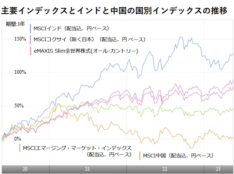 資産形成の手段として長期にわたってインデックスファンドをつみたて投資するという手法が普及している。インデックスファンドは信託報酬率が年0.1%台という水準で購入することが可能で、オンラインで購入すると購入時の手数料も不要になる。資金を効率的に運用できる点でも多くの投資家に推奨できる投資手法とされている。問題は、「どのインデックスを使うか?」ということになる。一時期は、米国株指数「S&P500」を使ったつみたてが人気を集めていたが、2022年以降に米国株の上昇勢いが衰えたことで、現在は「全世界株(オール・カントリー)」の人気が高まり、つみたて市場を2分する人気になっている。ただ、「全世界株(オール・カントリー)」は、「先進国株」と「新興国株」の合算であり、「S&P500」と比較すると、「新興国株」を新たに投資対象に加えた指数とみなすこともできる。その「新興国株」を代表する指数である「MSCIエマージング・マーケッツ」において、インドのウエイトが急速に高まり、存在感を増している。今後10年の成長市場といわれるインドの存在を考えれば、つみたて投資の対象ファンドとして「新興国株」も選択肢になるのではないだろうか。