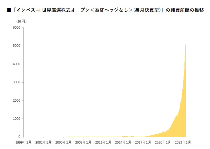 「インベスコ 世界厳選株式オープン<為替ヘッジなし>(毎月決算型)」(愛称:世界のベスト)の純資産残高が今月19日に5000億円台に乗せた(25日時点は5037億)。旺盛な純資金流入を背景に残高の増加ペースが加速している。 同ファンドは、日本を含む世界各国(新興国除く)の企業の中から、「株式投資の王道」とする「成長」、「配当」、「割安」の3つの観点に着目して厳選した企業の株式に投資する。2023年4月末時点のポートフォリオを見ると、組入銘柄数は46、組入比率上位は英投資会社の『3 iグループ』(5.9%)、仏大手容器メーカーの『ベラリア』(4.8%)、米ソフトウエア大手の『マイクロソフト』(4.5%)となっている。 純資産残高の推移を見ると、1999年1月の設定から約22年9カ月後の2021年10月12日に1000億円に到達。その後、約11カ月後の2022年9月13日に2000億円、約4カ月半後の2023年2月1日に3000億円、約2カ月後の2023年4月4日に4000億円到達と増加ペースが加速し、4000億円到達から約1カ月半で5000億円台に乗せた。 純資金流入額の増加ピッチも加速している。2023年4月は76カ月連続の純資金流入となり、3月に572億円と設定来最大の純資金流入額となったのに続き、4月も548億円と高水準となった。単月の平均を見ると、2021年の51億円から2022年は145億円となり、2023年(4月まで)は446億円となっている。 パフォーマンスを見ると、2023年4月末時点の過去10年間のトータルリターン(年率)は8.58%とカテゴリー「国際株式・グローバル・含む日本(為替ヘッジなし)」平均を0.22%下回り、カテゴリー内上位50%(91本中45位)であるが、過去3年間(年率)は22.23%とカテゴリー平均を5.31%上回ってカテゴリー内上位14%(254本中35位)、過去1年間は17.01%とカテゴリー平均を14.76%上回ってカテゴリー内上位1%(342本中2位)と改善が見られる。