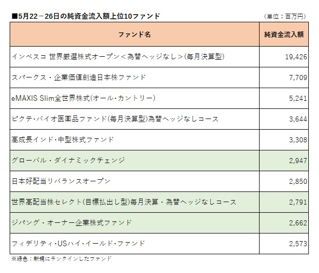 国内公募追加型株式投信(確定拠出年金専用、ファンドラップ専用、及びETF除く)を対象として、ウエルスアドバイザー推計値に基づいて先週(2023年5月22−26日)の純資金流入額上位10ファンドを確認したところ、22日に新規設定された大和アセットマネジメントの「グローバル・ダイナミックチェンジ」(愛称:大変革時代)が第6位となったほか、2ファンドがトップ10内に返り咲いた。 「グローバル・ダイナミックチェンジ」は実質的に、日本を含む世界の企業の中から、地政学の観点から各国の国家戦略上重要と判断される企業の株式に投資する。国家戦略上重要と判断されるカテゴリーとして、「エネルギー・資源の安全確保」、「コア技術の国内生産化」、「安全保障」を挙げている。実質的な運用は、BNYメロン・グループの米ニュートン・インベストメント・マネジメント・ノースアメリカ・エルエルシーが手掛ける。販売用資料によると、2023年2月末時点のモデルポートフォリオは55銘柄からなり、組入比率上位は、太陽光発電やEV向けバッテリー用半導体の原料となるポリシリコン生産大手の独『ワッカー・ケミー』(3.57%)、GPU(画像処理半導体)開発世界トップクラスの米『エヌビディア』(3.57%)、銅とモリブデンの生産世界大手の米『フリーポート・マクモラン』(3.57%)となっている。 先週トップ10内に返り咲いた2ファンドは、5月1−2日以来3週ぶりとなる「世界高配当株セレクト(目標払出し型)毎月決算・為替ヘッジなしコース」と、4月24−28日以来4週ぶりとなる「ジパング・オーナー企業株式ファンド」。 先週の純資金流入トップは「インベスコ 世界厳選株式オープン<為替ヘッジなし>(毎月決算型)」(愛称:世界のベスト)。194億円の純資金流入となり、5月1−2日以来3週ぶりのトップとなった。同ファンドのほかには、「スパークス・企業価値創造日本株ファンド」、「eMAXIS Slim全世界株式(オール・カントリー)」、「ピクテ・バイオ医薬品ファンド(毎月決算型)為替ヘッジなしコース」、「高成長インド・中型株式ファンド」、「日本好配当リバランスオープン」、「フィデリティ・USハイ・イールド・ファンド」が先々週(2023年5月15−19日)に続いてトップ10入りした。 一方、先々週トップ10入りしていたファンドのうち、「楽天 日本株3.8倍ベアII」、「ダイワ・US−REIT・オープン(毎月決算型)Bコース(為替ヘッジなし)」、「SBI 日本株3.8ベアII」がトップ10圏外となった。