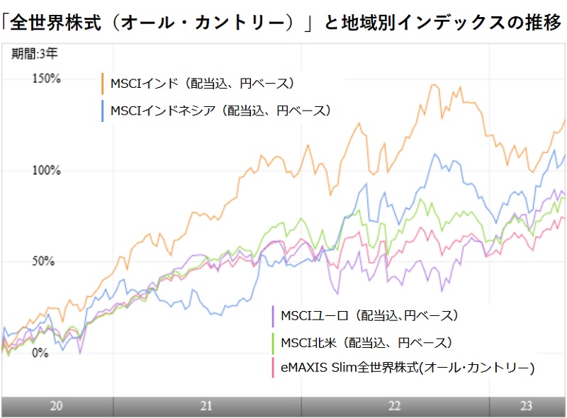 2022年以来の主要国の大幅な利上げが世界経済にどの程度のマイナスインパクトを与えるのか、市場はその影響を測りかねているようだ。たとえば、5月は米NASDAQ上場企業の好決算等にけん引されて世界の株価が上向いたものの、月末には一転して株安に見舞われた。特段大きな悪材料が出たわけでもないのだが、一旦下落方向に動き出すと、利益確定を焦るように次から次へと売り注文が増えるような展開だ。多くの投資家が、今後の展望に確信を持てず半身の姿勢で投資しているようにみえる。その中にあって、「向こう10年の成長が確実視される」として市場の注目を集めているのが「インド株」だが、そのインド株を上回るほどのパフォーマンスを残しているのが「インドネシア株」だ。国内公募ファンドでインドネシアに単独で投資するファンドは、わずかに4本と多くはないが、インドネシア株高を受けて、いずれも好パフォーマンスを残している。 今年4月末をベースに過去1年間のトータルリターンを調べると、全世界株式の代表的なインデックスである「MSCIオール・カントリー・ワールド・インデックス(配当込み、円ベース)」が6.01%に対し、先進国株式の「MSCIワールド(配当込み、円ベース)」は6.74%、新興国株の「MSCIエマージング・マーケット・インデックス(配当込み、円ベース)」は0.21%になっている。この1年間は先進国株がけん引していることがわかる。先進国の中では欧州圏の株価の上昇が目立ち、「MSCIフランス(配当込み、円ベース)」が28.99%、「MSCIドイツ(配当込み、円ベース)」が22.37%、「MSCI欧州(配当込み、円ベース)」は18.35%という状況だ。これに続くのが、「MSCI日本(配当込み、円ベース)」の10.50%で、「MSCI米国(配当込み、円ベース)」は3.94%という成績になっている。 これに対し、新興国は、「MSCI中国(配当込み、円ベース)」が5.17%と復調ぎみの動きになるものの、「MSCIブラジル(配当込み、円ベース)」が0.78%、「MSCI南アフリカ(配当込み、円ベース)」がマイナス1.19%など、冴えない成績の国が多い。「MSCIインド(配当込み、円ベース)」も前年の株価上昇の反動でマイナス3.15%とマイナス成長に落ち込んでいる。そのような中で、「MSCIインドネシア(配当込み、円ベース)」は8.41%と中国を上回る成績を残している。 インドネシアの成績は、過去1年だけでなく、過去3年(年率)で30.86%、5年(同)は9.66%、10年(同)は4.52%と、中長期に振り返っても好調だ。この成績は、インドの3年(年率)29.02%、5年(年率)10.90%、10年(年率)10.61%と比較して、10年を除けばそん色ない水準といえる。中国の3年(年率)0.97%、5年(年率)マイナス0.49%、10年(年率)6.27%と比較すると、同じように10年では見劣りするものの、5年以下の成績は大幅に上回っている。過去10年という期間は、先進国株式の「MSCIワールド」が年率12.76%と2ケタで成長したように、米国を中心とした先進国の株価が市場をリードした10年だった。その中にあって、近年、先進国を凌駕して大きく成長しているのがインドやインドネシアということになる。 インドネシアの特徴は、人口が約2.75億人と米国(約3.38億人)に次ぐ世界第4位の人口大国である点。インドの成長見通しに中国を抜いて世界1位になった人口(14.23億人)の多さがあるように、経済の土台となる人口が多く、しかも、年齢構成が若く労働人口が増えていることがポイントになる。インドネシアの労働人口は総人口の約半分(2021年に49.09%)であり、2055年まで生産年齢人口が増え続けると予想されている。そして、1人当たりGDP(2023年4月時点)はインドの2379米ドルに対し、インドネシアは4798米ドルと、インドよりも先行して成長してきたため、今後の成長スピードについてはインドには敵わないと考えられる。しかし、同じアジア圏ではタイの7650米ドル、マレーシアの1万2364米ドル、中国の1万2813米ドルなどと比較すると大きく出遅れており、今後の成長余力の大きさも感じられる。 インドネシアは2019年8月に、首都を現在のジャカルタからカリマンタン島・東カリマンタン州の東部に移転すると決定した。ジャカルタは急増した人口により、インフラの整備が追い付かず、慢性的な交通渋滞など首都に集中した人口の弊害が指摘され、首都移転はその解消が目的。新首都は2045年の完成をめざし、ジャングルを切り拓いて建設されていることから、今後、様々なインフラ投資等が期待されてもいる。 インドネシア株式に投資するファンドは、残高が最大のファンドで「イーストスプリング・インドネシア株式オープン」の94.6億円で100億円に届かない。まだまだ、日本においてはマイナーな存在だ。次いで、「(ノムラ・アジア)インドネシア・フォーカス」で41.98億円。このファンドは、野村證券が提供するアジアの国々に投資するファンドシリーズの1つで、他には「インド」、「アセアン」、「豪州」、「タイ」、「フィリピン」がある。そして、「NN インドネシア株式ファンド」は残高が25.75億円、「アムンディ・インドネシア・ファ