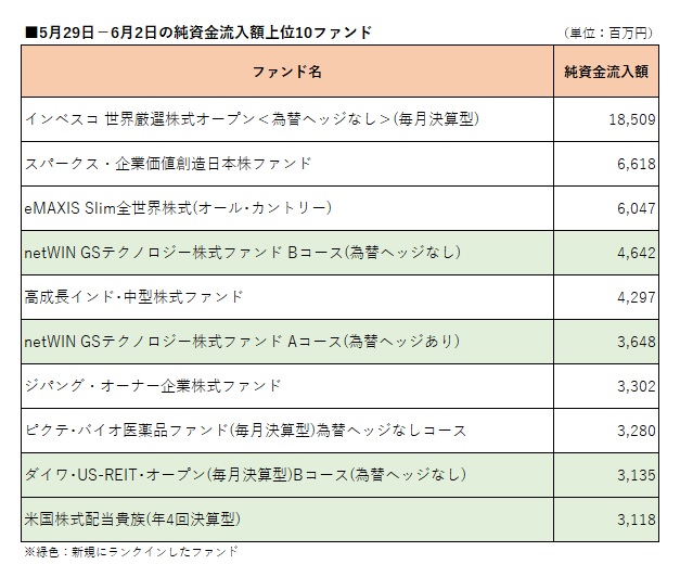 国内公募追加型株式投信(確定拠出年金専用、ファンドラップ専用、及びETF除く)を対象として、ウエルスアドバイザー推計値に基づいて先週(2023年5月29日−6月2日)の純資金流入額上位10ファンドを確認したところ、「インベスコ 世界厳選株式オープン<為替ヘッジなし>(毎月決算型)」(愛称:世界のベスト)が2週連続のトップとなったほか、4ファンドが新規にランクインした。 「インベスコ 世界厳選株式オープン<為替ヘッジなし>(毎月決算型)」は185億円の純資金流入となった。同ファンドのほかには、「スパークス・企業価値創造日本株ファンド」、「eMAXIS Slim全世界株式(オール・カントリー)」、「高成長インド・中型株式ファンド」、「ジパング・オーナー企業株式ファンド」、「ピクテ・バイオ医薬品ファンド(毎月決算型)為替ヘッジなしコース」が先々週(2023年5月22−26日)に続いてトップ10入りした。 新規にトップ10内入りしたファンドは、「netWIN GSテクノロジー株式ファンド」の「Aコース(為替ヘッジあり)」と「Bコース(為替ヘッジなし)」、「ダイワ・US−REIT・オープン(毎月決算型)Bコース(為替ヘッジなし)」、「米国株式配当貴族(年4回決算型)」。 「netWIN GSテクノロジー株式ファンド」の「Aコース(為替ヘッジあり)」は2022年以降では初めて、「Bコース(為替ヘッジなし)」は同年11月28−12月2日以来半年ぶりのランクインとなった。両ファンドともに、5月と11月の年2回決算。「ダイワ・US−REIT・オープン(毎月決算型)Bコース(為替ヘッジなし)」は5月15−19日以来2週ぶり、「米国株式配当貴族(年4回決算型)」は5月1−2日以来4週ぶりのランクインとなった。 一方、先々週トップ10入りしていたファンドのうち、「グローバル・ダイナミックチェンジ」(愛称:大変革時代)、「日本好配当リバランスオープン」、「世界高配当株セレクト(目標払出し型)毎月決算・為替ヘッジなしコース」、「フィデリティ・USハイ・イールド・ファンド」がトップ10圏外となった。