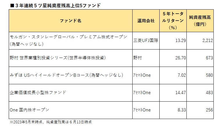 2023年5月末時点において、ウエルスアドバイザーのファンドレーティングが過去3年間(36カ月、2020年6月−2023年5月)連続して5ツ星となったアクティブファンドは22本となった。米国ハイイールド債券に投資するファンドが新たに到達し、前月から1本増加した。 ファンドレーティングは、原則として、運用期間3年以上の国内公募追加型株式投信を対象として、ファンドのリスク調整後のリターンがその属するカテゴリー内でどの水準にあるのかを5段階で示したものだ。最上位の5ツ星は、運用効率に優れていることを表す。3年連続5ツ星ファンドの集計に際しては、「確定拠出年金専用、ファンドラップ専用、ETF除く」アクティブファンドを対象とした。 今回新たに到達したのは、アセットマネジメントOneの「MHAM USハイイールドファンド(毎月決算型)」。同ファンドは、実質的に、米国の米ドル建てのハイイールド債券に投資する。ポートフォリオ組入銘柄は、個別企業に対する定性・定量分析にマクロ経済分析を加味して選択する。定性分析では経営陣の質と競争優位性、定量分析では資産、キャッシュフロー、業績、マクロ経済分析では資本市場・信用リスク環境、金融当局の政策スタンスなどに着目する。実質的な運用は、米ロード・アベット社が担う。2023年5月末時点のポートフォリオの平均最終利回りは8.02%となっている。 3年連続5ツ星となった22ファンドの中では、「モルガン・スタンレーグローバル・プレミアム株式オープン(為替ヘッジなし)」が残高トップ(6月13日時点の純資産残高は2212億円)となり、「野村 世界業種別投資シリーズ(世界半導体株投資)」(同673億円)が続いた。「モルガン・スタンレーグローバル・プレミアム株式オープン(為替ヘッジなし)」には2023年5月までの過去1年間で約387億円、「野村 世界業種別投資シリーズ(世界半導体株投資)」には約142億円の純資金が流入している(2023年5月はウエルスアドバイザー推計値使用)。