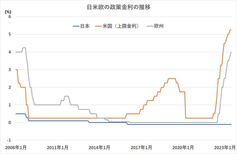 米連邦準備制度理事会(FRB)は2022年3月以来、10会合連続で利上げを続けてきたが、6月14日までのFOMCで利上げの見送りを決定した。ただ、年内の再利上げの可能性を示唆した。翌15日までに欧州中央銀行(ECB)が0.25%の利上げを決定し、次回7月の会合でも利上げを継続する方針を明言した。そして、16日までの日本銀行の政策決定会合では大規模な金融緩和政策の維持が決定された。この結果、米国の政策金利は年5.00〜5.25%、欧州は4.0%となり、ゼロ%金利を貫く日本との違いが一段と鮮明になった。米国が利上げを一旦停止したように、金融引締めで先行した米国の政策が曲がり角にきているようだ。今後の金利の見通しは、世界の株式市場や為替相場に大きな影響を与える。6月15日にレポートを発信したPIMCO(ピムコ)は、「米国は7月の追加利上げを予想するが、それ以降の利上げは懐疑的」としている。 米国が利上げの停止を行ったのは、過去1年あまりで累計5%も引き上げた金融引締めの効果を見極めるためとしている。FRBのパウエル議長は、利上げの一時休止期間は短い可能性を示唆した。この議長の発言に対してPIMCOは、「FRBは、条件が許す限り1回の会合ごとに利上げするか見送るかを選択できるよう、選択肢を残そうとしている」と解釈している。そして、「FRBは引き続き、インフレ抑制策をやり過ぎるリスクより、やらな過ぎるリスクのほうが大きいと考えている」と分析する。また、パウエル議長は、今後2回に1回の間隔で利上げを実施する可能性をほのめかしたものの、「年後半にマクロ経済が軟化するとのPIMCOの予測を踏まえると、FRBの最新の予測に含まれるすべての利上げ(少なくとも2回の追加利上げ)の実施については懐疑的」と見通している。 FRBの金利据え置きの決定については、事前に予測されたことだったが、FOMC参加者の金利予測分布図については、2023年の予想金利の中央値が5.6%と現状よりも0.5%高い水準に引き上げられたことが市場の関心になった。参加者18名中12名が、年内に少なくとも0.5%の追加利上げを予想している。それほど、足元の経済が力強いとみていることの反映といえる。これに対し、PIMCOは、「米経済は引き続き二極化している。インフレ指標は労働市場と同様、底堅く推移しているが、他方で、給与の伸びは鈍化を続け、企業は労働時間を短縮している。また、賃貸料の上昇率など、極めて粘着性の高かったインフレ・セクターもついにピークを迎えたようにみえる」と、経済のマクロリスクが高まっていると分析している。そのため、PIMCOは7月にあと一回追加利上げを実施し、それが今回の利上げサイクルのピークになる可能性が高いという見通しだ。それだけに、「経済指標の実績値が予想以上に強く、FRBに利上げ継続圧力がかかった場合、大幅な景気減速の可能性が高まる」と警戒している。 一方、ECBは、インフレ率が減速している点を認めつつ、2%の物価目標の達成には利上げの継続が必要との立場を崩していない。ラガルド総裁は、「利上げを一時停止するべきか、もしくは。利上げを見送るかという点については、まったく議論しなかった。やるべきことはまだあり、利上げ停止を検討し始めてもいない」という立場だ。そして、政策金利の最終到達点を示す「ターミナルレート」については、「コメントするつもりはない。ターミナルレートは、そこにたどり着いて初めて判明するものだ。金融政策を動かしているのは、最終的にインフレ率2%の達成だ」と語った。 これに対し、日銀の植田総裁は16日の政策決定後の会見で、日本の物価指標は2022年4月以来、2023年4月まで13カ月連続で2%を上回り、22年8月以降は3%を超える物価上昇が続いているものの、「当面は物価が下がる局面にあると考えている。下がり方はやや想定より遅いが、この先、さらに下がっていくとみている」との見通しを示し、金融政策を変更する必要はないとの判断をしているという。前年比で9%などというインフレ率を示した米国や欧州と比較すると、高くとも4%程度だった日本では、金融政策の判断に違いがでるのは当然だが、この中央銀行の政策スタンスの差が、たびたび、為替相場での円安への圧力として働いてきた。 今後、米国の政策によっては、欧州や日本の対応に変化が現れるということも考えられる。米国は、主要国の中で、最も早く利上げへの転換に踏み出し、その利上げのペースも非常に速いものだった。遅れて追随した欧州、何もできなかった日本に対して、政策の自由度は大きな立場を得ている。各国の主要な株価指数は、前年末比で6月15日までに、米国のS&P500が15.27%の上昇、ドイツのDAXは17%上昇に対し、日本の日経平均株価は28.32%上昇になっている。日銀総裁の記者会見ではメディアから、「日本株はバブルではないのか?」という指摘も出ていた。このような株価の動きについても、各国中央銀行の金融政策によって影響を受けることになる。金融政策の転換期に差し掛かったといえる今、今
