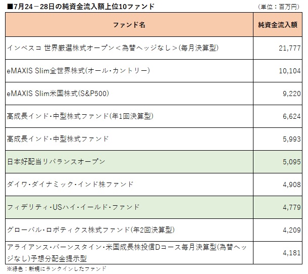 国内公募追加型株式投信(確定拠出年金専用、ファンドラップ専用、及びETF除く)を対象として、ウエルスアドバイザー推計値に基づいて先週(2023年7月24−28日)の純資金流入額上位10ファンドを確認したところ、「インベスコ 世界厳選株式オープン<為替ヘッジなし>(毎月決算型)」(愛称:世界のベスト)が3週連続のトップとなったほか、2ファンドが新規にトップ10入りした。 「インベスコ 世界厳選株式オープン<為替ヘッジなし>(毎月決算型)」の純資金流入額は約218億円。同ファンドのほかには、「eMAXIS Slim全世界株式(オール・カントリー)」、「eMAXIS Slim米国株式(S&P500)」、「高成長インド・中型株式ファンド(年1回決算型)」、「高成長インド・中型株式ファンド」、「ダイワ・ダイナミック・インド株ファンド」、「グローバル・ロボティクス株式ファンド(年2回決算型)」、「アライアンス・バーンスタイン・米国成長株投信Dコース毎月決算型(為替ヘッジなし)予想分配金提示型」が先々週(7月18−21日)に続いてトップ10内となった。 先週新たにトップ10入りしたのは、「日本好配当リバランスオープン」と「フィデリティ・USハイ・イールド・ファンド」。順に、5月22−26日以来、6月26−30日以来のランクインとなった。 一方、先々週トップ10入りしていたファンドのうち、「楽天・全米株式インデックス・ファンド」(愛称:楽天・VTI)と「SBI・V・S&P500インデックス・ファンド」(愛称:SBI・V・S&P500)がトップ10圏外となった。