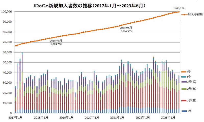 国民年金基金連合会が8月1日に発表したiDeCo(イデコ、個人型確定拠出年金)の業務状況によると6月の新規加入者数は3万7323人で加入者総数は299万3738人になった。新規加入者数は、2023年2月から5カ月連続で前年同月比割れになった。また、月間の新規加入者数はゴールデンウィーク明けの6月には大きく増大する傾向があり、前年6月は5.5万人の新規加入があった。このため、23年6月の新規加入者は前年同月比マイナス33.1%と大幅な減少になっている。なお、従業員のiDeCoに企業が上乗せ拠出をするiDeCo+(中小事業主掛金納付制度)は、実施事業所数は6316事業所、対象従業員数は4万259人と4万人の大台に達した。 6月の新規加入者の内訳は、第1号加入者は4777人(前月4194人)、第2号加入者は3万585人(前月2万7773人)、第3号加入者は1632人(前月1417人)となった。第2号加入者の中で、企業年金なしの新規加入者が1万7874人(前月1万6451人)。共済組合員(公務員)の新規加入者は5296人(前月4418人)となった。第2号加入者の中で「企業年金あり」が7415人(前月6904人)だった。 第2号の「企業年金あり」だけが、加入者属性別の新規加入者で前年同月比でプラス(8.4%)になっているが、この区分は制度改定によって加入手続きが容易になったため、2022年10月から加入者数が大幅に増大。前月でも前年月期比22.9%増と大幅な伸びを記録していた。それと比較すると、1ケタ台の伸び率は勢いがなくなったことを印象付ける。また、共済組合員(公務員)の新規加入者は、前年同月比でマイナス41.2%と大きく加入者増が鈍化している。