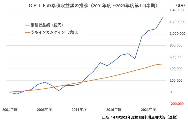 GPIF(年金積立金管理運用独立行政法人)が8月4日に発表した2023年度第1四半期運用状況(速報)によると、第1四半期(4月〜6月)の収益額は18兆9834億円で期間収益率は9.49%だった。外国株式(MSCI ACWI除く日本、円ベース)が期間収益率で15.49%と好調だったことに加え、国内株式(TOPIX配当込み)も同14.45%と好調を持続し、四半期ベースとしては非常に高い収益率を確保した。GPIFの運用収益の推移を振り返ると、株式だけでなく債券も含めた分散投資の重要性に改めて気づかされる。 GPIFは2001年度から市場運用を開始し、2023年6月末まで22年間余りで、累積収益額は127兆3658億円に達している。運用収益は1年間で25.15%(2020年度)と非常に好調な時もあれば、逆に、マイナス7.57%(2008年度)とマイナスリターンになった年度もある。2001年度から2022年度まで22年間の勝敗は15勝7敗(15年間でプラスリターン、7年間でマイナスリターン)となっているが、目立つのは、プラスリターンの時は2ケタ(2012年度、2014年度、2020年度)のプラスを獲得するものの、マイナスリターン時にはマイナス幅が1ケタ台であり、下落時の損失が抑えられていることだ。このマイナスリターンを小さくする機能が「分散投資」にはある。 GPIFは基本的な資産構成比を示す「基本ポートフォリオ」を、厚生労働大臣が求める運用収益率に対応するため、定期的に見直してきている。たとえば、2014年10月30日には、それまで「国内債券60%、国内株式12%、外国債券11%、外国株式12%」だったものを、「国内債券35%、国内株式25%、外国債券15%、外国株式25%」とした。そして、2020年4月1日に、「国内債券35%、国内株式15%、外国債券25%、外国株式25%」だった比率を「国内債券25%、国内株式25%、外国債券25%、外国株式25%」に変更した。基本的に国内債券の運用比率を落として、株式と外国資産の比率を高める変更を行ってきた。 このような基本ポートフォリオにおける国内債券への投資配分を落としてきたのは、この期間に国内債券の利回りが低下し、中核資産である10年国債利回りがゼロ%で定着し、国内債券でのリターンが期待できなくなっていたという背景がある。債券の利息や株式の配当収入などを示す「インカムリターン」は、国内債券からの収益見込みが低下するため、外国債券やREIT(不動産投信)などへの配分を増やしてインカム収益の確保に努めてきた。その結果、外国債券への投資比率は2014年当時の11%から、現在では25%にまで高まっている。 そして、GPIFの運用で注目されるのは、このインカム収益の継続した積み上がりだ。株式等のリスク資産による収益は、その時々の市場環境によってプラス・マイナスのどちらかに大きく動くことがあるが、インカム収益は投資資産を保有していることによって、「利回り」による収益を見通すことができる(投資対象が予定利率を引き下げたりすることなどもあるため、確実ではない)。実際に、GPIFのインカム収益は2001年度以来、マイナスになったことがない。むしろ、2007年度以降は年間2兆円程度の収益を安定的に確保し、2018年度以降は、その収益額が3兆円を超えるようになってきた。GPIFが市場運用を始めた2001年度は、いわゆる「ITバブル崩壊」の影響を受けて世界的に株式市場が下落する局面にあった。このため、収益額は、2001年度、2002年度と2年間連続でマイナス収益でスタートしているが、この2年間にあっても、インカム収益は2001年度5378億円、2002年度6518億円としっかりプラスリターンを稼いでいた。 結果的に、過去22年余りの運用において、市場下落時のマイナス幅を低く抑えることができた大きな要因に、このインカム収入の安定した確保ということが効果的だったといえる。投資をしていると、株価が急速に値上がりすることに惹かれて、株式への投資比率を高く保ちたくなるものだが、実際には株価は上昇を続けることはなく、急速に値上がりした株価は、その後、急速に値下がりすることが多い。このように価格変動の大きな株式に過度に投資してしまうと、資産の価値全体が株価の上下によって大きく変動し、ハラハラドキドキし続けなければならなくなってしまう。その点、ある程度の見通しが持てるインカム収入を一定水準で確保することによって、資産全体の価格変動を抑えることは重要だ。 残念ながら、未だに国内債券の利回りは10年国債でも年1%に届かない低金利が継続している。これと比較すれば、欧米の債券利回りは米国債や英国債が10年もので4%台など、魅力的な水準の利回りになっている。海外債券には為替変動のリスクが伴うものの、安定した利回りが得られる外国債券を加えることによって、株価変動のリスクを抑えることを考えたい。GPIFが行っている長期の資産運用は、個人投資家が行う資産形成のお手本になり得るのではないだろうか。(グラフは、GPIFの累積収益額の推移)