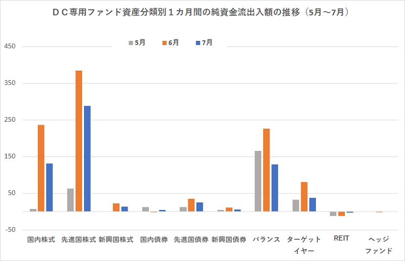 DC専用ファンドの2023年7月の純資金流出入額(速報値)は約630億円の資金流入超過になった。資金流入超過は2020年12月以降32カ月連続になった。流入額のトップは前月と同様に「先進国株式」で資金流入額は前月の約384億円から288億円と減少したものの月間の資金流入額としては高い水準を維持。次いで、「国内株式」の約130億円だった。前月同様に「先進国株式」や「国内株式」に資金が流れる傾向が続いている。一方、「REIT」が約3億円の資金流出で、4カ月連続の資金流出になった。 DC専用ファンド全体の純資産総額は約11兆14億円と前月から約1189億円増加して初めて11兆円の大台に乗せた。残高の内訳は、株式ファンド51%、債券ファンド14%、バランスファンド34%という割合で、前月と比較して株式ファンドが1%ポイント向上した。 (※個別のDC規約では、DC専用ファンド以外のファンドを制度に採用している場合があるため、DC専用ファンド全体の純資産総額は、国内DC制度全体で運用されているファンドの残高とは一致しない) ■資金流入額ランキングのトップは「野村 外国株式インデックスF(確定拠出年金)」 DC専用ファンドの過去1カ月間の純資金流入額ランキングのトップは、前月同様に「野村 外国株式インデックスファンド(確定拠出年金)」だった。第2位も前月と同じ「三井住友・DC外国株式インデックスファンドS」が入った。トップ10のうち、8本を先進国株式インデックスに連動するインデックスファンドが占めた。前月は6本が先進国株式インデックスに連動するインデックスファンドだったことから、一段と占有率が高まった。残る2本は、国内株式(TOPIX連動型)のインデックスファンドとバランス型ファンドだった。 過去1年間のトータルリターンでは、先進国株式インデックスは20%程度であることに対して、TOPIX連動型の国内株式インデックスファンドは約23%と高いリターンを残しているにもかかわらず、先進国株式インデックスファンドの人気が引き続き高い。先進国インデックスファンドの人気を支えているのは、株価指数「MSCI−KOKUSAIインデックス」において資産配分比率が7割超を占める米国株式の将来性への期待感といえる。一般の公募投信のつみたて投資でも米国「S&P500」に連動するインデックスファンドの人気が高い。しかし、米国株式市場優位の展開が今後も長きにわたって継続すると決まっているわけでもないことを考えると、日本株ファンドなどパフォーマンスが優位にある他のファンド群に物色の人気が回らないのは奇異な印象がする。 ■トータルリターンのトップは「クスリのアオキホールディングス株式F(DC)」 個別ファンドの過去1年間のトータルリターンランキングトップは、前月まで5カ月連続でトップだった「DCダイワ中小型株ファンド」が第2位に後退し、前月は第2位だった「クスリのアオキホールディングス株式F(DC)」がトップになった。前月は第3位だった「野村 国内株式アクティブ(確定拠出年金)」が4位に後退し、第3位には「野村DC日本株式アクティブファンド」が入った。また、第5位には「ノムラ・ジャパン・オープン(確定拠出年金)」が入り、トップ5のうち4ファンドを野村アセットマネジメントの日本株ファンドが占めている。 なお、4月、5月と同様にトップ10を日本株式で運用するファンドが占めたが、ランキングされているのは、引き続き、全て国内運用会社が運用するアクティブファンドになっている。運用成績は良いものの、運用コスト(信託報酬)もインデックスファンドと比較すると高い。インデックスファンドが年0.15%程度になっているところ、アクティブファンドは1%前後から1.5%程度になってしまう。ただ、パフォーマンスをみれば、インデックスファンドが過去1年間で約23%のトータルリターンのところ、アクティブファンドのパフォーマンス上位では同30%を超えるリターンを記録している。パフォーマンス上位のファンドでは信託報酬率の差を大きく上回るリターンになっていることになる。信託報酬が低いファンドを選ぶというのは、長期投資の基本であるが、信託報酬を考慮してもなお魅力的なパフォーマンスを残しているファンドがあることは留意したい。(グラフは、DC専用ファンドの資産クラス別資金流出入の状況)