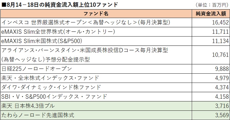 国内公募追加型株式投信(確定拠出年金専用、ファンドラップ専用、及びETF除く)を対象として、ウエルスアドバイザー推計値に基づいて先週(2023年8月14日−18日)の純資金流入額上位10ファンドを確認したところ、「インベスコ世界厳選株式オープン<為替ヘッジなし>(毎月決算型)」(愛称:世界のベスト)が3週ぶりのトップとなったほか、2ファンドが返り咲いた。 「インベスコ世界厳選株式オープン<為替ヘッジなし>(毎月決算型)」は、日本を含む先進国株式の中から、「成長」、「配当」、「割安」という3つのポイントに着目し、独自の視点で厳選した「世界のベスト」と考える銘柄に投資を行うファンド。2023年7月末時点の過去1年間のトータルリターンは26.52%で、同時期の米国株式インデックスファンド「eMAXIS Slim米国株式(S&P500)」の19.48%や全世界株式インデックスファンド「eMAXIS Slim全世界株式(オール・カントリー)」の19.38%よりも高いリターンをあげている。また、毎月決算型は、1万口当たり150円の分配金を毎月分配し、かつ、基準価額が右肩上がりで上昇するというパフォーマンスの良さが目立っている。 「eMAXIS Slim米国株式(S&P500)」は約117億円の純資金流入となり、先週のトップから第2位に順位を落としたものの引き続き100億円を超える資金流入が続いている。このほかには、「eMAXIS Slim全世界株式(オール・カントリー)」、「アライアンス・バーンスタイン・米国成長株投信Dコース毎月決算型(為替ヘッジなし)予想分配金提示型」、「日経225ノーロードオープン」、「楽天・全米株式インデックス・ファンド」(愛称:楽天・VTI)、「ダイワ・ダイナミック・インド株ファンド」、「SBI・V・S&P500インデックス・ファンド」(愛称:SBI・V・S&P500)、が先々週(8月7日−8月10日)に続いてトップ10入りした。 先週トップ10内に返り咲いたのは、「楽天 日本株4.3倍ブル」と「たわらノーロード先進国株式」となった。 一方、先々週トップ10入りしていたファンドのうち、「高成長インド・中型株式ファンド」と「高成長インド・中型株式ファンド(年1回決算型)」がトップ10圏外となった。