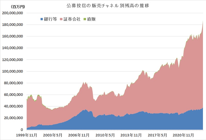 「新NISA」で求められる安定的に資産が増える金融商品とは、どの運用会社も取り組んできている商品といえる。それぞれの会社が理論的には、安定的に運用が可能という仕組みを考え出して商品化しているが、実際の投資環境は、過去のシミュレーションの結果と同じようには動かないため、必ずしも設計通りのパフォーマンスをあげられているわけではない。各社、その都度、微調整を重ね、新たな知見を加えるなどのテコ入れもしながら「安定的な運用」に相応しい商品を目指して奮闘しているということが実際のところだ。「新NISA」が始まって月日が経過し、どの販売会社も、あるいは、投資家の多くから、「あの運用会社の、この商品に投資しておけば間違いない」というような信頼を勝ち得る商品が出てくることが、「新NISA」の発展には不可欠の要素といえる。各社の運用の腕が試されている。(グラフは公募投信の販売チャネル別残高の推移)