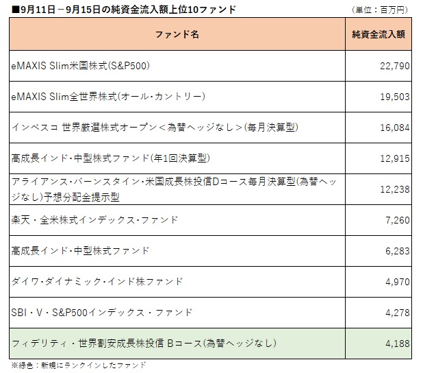 国内公募追加型株式投信(確定拠出年金専用、ファンドラップ専用、及びETF除く)を対象として、ウエルスアドバイザー推計値に基づいて先週(2023年9月11日−15日)の純資金流入額上位10ファンドを確認したところ、「eMAXIS Slim米国株式(S&P500)」が2週連続のトップとなった。同ファンドを含め9ファンドが先々週(9月4−8日)に続いてトップ10入りした。 「eMAXIS Slim米国株式(S&P500)」の純資金流入額は約228億円。同ファンドのほかには、「eMAXIS Slim全世界株式(オール・カントリー)」、「インベスコ 世界厳選株式オープン<為替ヘッジなし>(毎月決算型)」(愛称:世界のベスト)、「高成長インド・中型株式ファンド(年1回決算型)」、「高成長インド・中型株式ファンド」、「アライアンス・バーンスタイン・米国成長株投信Dコース毎月決算型(為替ヘッジなし)予想分配金提示型」、「楽天・全米株式インデックス・ファンド」(愛称:楽天・VTI)、「ダイワ・ダイナミック・インド株ファンド」、「SBI・V・S&P500インデックス・ファンド」(愛称:SBI・V・S&P500)が先々週に続いてトップ10入りした。 先週新規にランクインしたのは、「フィデリティ・世界割安成長株投信 Bコース(為替ヘッジなし)」(愛称:テンバガー・ハンター)。約42億円の純資金流入となり、8月21−25日以来3週ぶりのランクインとなった。 一方、先々週トップ10入りしていたファンドのうち、「次世代米国代表株ファンド」(愛称:メジャー・リーダー)がトップ10圏外となった。