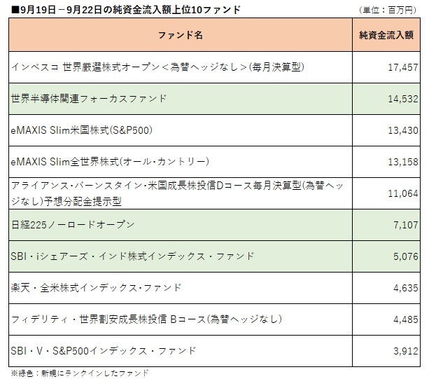 国内公募追加型株式投信(確定拠出年金専用、ファンドラップ専用、及びETF除く)を対象として、ウエルスアドバイザー推計値に基づいて先週(2023年9月19日−22日)の純資金流入額上位10ファンドを確認したところ、新規設定の「世界半導体関連フォーカスファンド」と「SBI・iシェアーズ・インド株式インデックス・ファンド」(愛称:サクっとインド株式)がランクインしたほか、「日経225ノーロードオープン」が8月14−18日以来5週ぶりに返り咲いた。 「世界半導体関連フォーカスファンド」はSBI岡三アセットマネジメントが20日に運用を開始した。外国籍ファンドへの投資を通じて、実質的に、日本を含む世界の半導体関連企業の中から、成長性や株価の割安感などを踏まえて絞り込んだ35〜65社の株式に投資する。外国籍ファンドの運用はニューバーガー・バーマン・インベストメント・アドバイザーズが手掛ける。 「SBI・iシェアーズ・インド株式インデックス・ファンド」はSBIアセットマネジメントが22日に運用を開始した。ブラックロックが運用する「iシェアーズ・コア S&P BSE SENSEXインディアETF」への投資を通じて、「S&P BSE SENSEXインデックス(配当込み、円換算ベース)」に連動する運用を目指す。「S&P BSE SENSEXインデックス」は、インドのボンベイ証券取引所に上場する銘柄の中から、流動性、取引規模、業種などに基づいて選定された30銘柄で構成される株価指数である。 先週の純資金流入額トップは、「インベスコ 世界厳選株式オープン<為替ヘッジなし>(毎月決算型)」(愛称:世界のベスト)。約175億円の純資金流入となり、先々週(9月11−15日)の3位から浮上して、8月28日−9月1日以来3週ぶりのトップとなった。同ファンドのほかには、「eMAXIS Slim米国株式(S&P500)」、「eMAXIS Slim全世界株式(オール・カントリー)」、「アライアンス・バーンスタイン・米国成長株投信Dコース毎月決算型(為替ヘッジなし)予想分配金提示型」、「楽天・全米株式インデックス・ファンド」(愛称:楽天・VTI)、「フィデリティ・世界割安成長株投信 Bコース(為替ヘッジなし)」(愛称:テンバガー・ハンター)、「SBI・V・S&P500インデックス・ファンド」(愛称:SBI・V・S&P500)が先々週に続いてトップ10入りした。 一方、先々週トップ10入りしていたファンドのうち、「高成長インド・中型株式ファンド(年1回決算型)」、「高成長インド・中型株式ファンド」、「ダイワ・ダイナミック・インド株ファンド」がトップ10圏外となった。