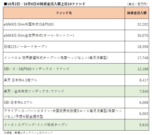 国内公募追加型株式投信(確定拠出年金専用、ファンドラップ専用、及びETF除く)を対象として、ウエルスアドバイザー推計値に基づいて先週(2023年10月2−6日)の純資金流入額上位10ファンドを確認したところ、「eMAXIS Slim米国株式(S&P500)」が3週ぶりのトップとなったほか、3ファンドが新規にランクインした。 「eMAXIS Slim米国株式(S&P500)」は322億円の純資金流入となり、先々週(9月25−29日)の4位から浮上し、9月11−15日以来3週ぶりのトップとなった。同ファンドのほかには、「eMAXIS Slim全世界株式(オール・カントリー)」、「日経225ノーロードオープン」、「インベスコ 世界厳選株式オープン<為替ヘッジなし>(毎月決算型)」(愛称:世界のベスト)、「楽天 日本株4.3倍ブル」、「SBI 日本株4.3ブル」、「アライアンス・バーンスタイン・米国成長株投信Dコース毎月決算型(為替ヘッジなし)予想分配金提示型」が先々週に続いてトップ10入りした。 先週新たにランクインしたのは、「SBI・V・S&P500インデックス・ファンド」(愛称:SBI・V・S&P500)、「楽天・全米株式インデックス・ファンド」(愛称:楽天・VTI)、「イーストスプリング・インド株式オープン」。「SBI・V・S&P500インデックス・ファンド」と「楽天・全米株式インデックス・ファンド」は9月19−22日以来2週ぶり、「イーストスプリング・インド株式オープン」は今年初めてのランクインとなった。 一方、先々週トップ10入りしていたファンドのうち、「日本企業PBR向上ファンド」(ブレイクスルー)、「イーストスプリング・インド消費関連ファンド」、「しんきん インデックスファンド225」がトップ10圏外となった。