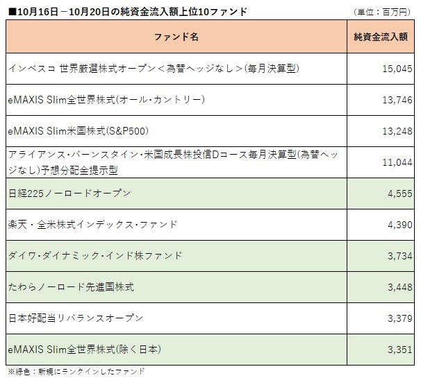 国内公募追加型株式投信(確定拠出年金専用、ファンドラップ専用、及びETF除く)を対象として、ウエルスアドバイザー推計値に基づいて先週(2023年10月16−20日)の純資金流入額上位10ファンドを確認したところ、「インベスコ 世界厳選株式オープン<為替ヘッジなし>(毎月決算型)」(愛称:世界のベスト)が3週ぶりのトップとなったほか、4ファンドが返り咲いた。 「インベスコ 世界厳選株式オープン<為替ヘッジなし>(毎月決算型)」(愛称:世界のベスト)は150億円の純資金流入。先々週(10月10−13日)の3位から順位を上げ、9月25−29日以来のトップとなった。同ファンドのほかには、「eMAXIS Slim全世界株式(オール・カントリー)」、「eMAXIS Slim米国株式(S&P500)」、「アライアンス・バーンスタイン・米国成長株投信Dコース毎月決算型(為替ヘッジなし)予想分配金提示型」、「楽天・全米株式インデックス・ファンド」(愛称:楽天・VTI)、「日本好配当リバランスオープン」が先々週に続いてトップ10入りした。 先週トップ10内に返り咲いたのは、「日経225ノーロードオープン」、「ダイワ・ダイナミック・インド株ファンド」、「たわらノーロード先進国株式」、「eMAXIS Slim全世界株式(除く日本)」。順に、10月2−6日以来、9月11−15日以来、8月14−18日以来、5月8−12日以来のトップ10入りとなった。 一方、先々週トップ10入りしていたファンドのうち、「SBI・V・S&P500インデックス・ファンド」(愛称:SBI・V・S&P500)、「イーストスプリング・インド消費関連ファンド」、「三井住友・DCつみたてNISA・全海外株インデックスファンド」、「楽天・全世界株式インデックス・ファンド」(愛称:楽天・VT)がトップ10圏外となった。