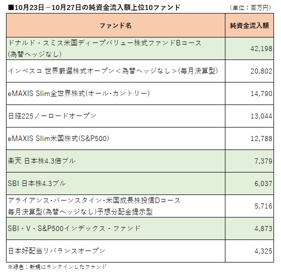 国内公募追加型株式投信(確定拠出年金専用、ファンドラップ専用、及びETF除く)を対象として、ウエルスアドバイザー推計値に基づいて先週(2023年10月23−27日)の純資金流入額上位10ファンドを確認したところ、三井住友DSアセットマネジメントが23日に設定した「ドナルド・スミス米国ディープバリュー株式ファンドBコース(為替ヘッジなし)」(=『ドナルド・スミス米国ディープバリュー株式B(H無)』)がトップとなったほか、3ファンドが返り咲いた。 「ドナルド・スミス米国ディープバリュー株式ファンドBコース(為替ヘッジなし)」は実質的に、米国上場企業の中から、その本源的価値と比べて極めて割安で投資魅力度が高いと判断した企業の株式に投資する。実質的な運用は、バリュー株式運用を専門とする米独立系運用会社のドナルド・スミス・アンド・カンパニーが行う。 先週トップ10内に返り咲いたのは、「楽天 日本株4.3倍ブル」、「SBI 日本株4.3ブル」、「SBI・V・S&P500インデックス・ファンド」(愛称:SBI・V・S&P500)。「楽天 日本株4.3倍ブル」と「SBI 日本株4.3ブル」は10月2−6日以来3週ぶり、「SBI・V・S&P500インデックス・ファンド」は10月10−13日以来2週ぶりのランクインとなった。 先々週(10月16―20日)に続いてランクインしたのは、「インベスコ 世界厳選株式オープン<為替ヘッジなし>(毎月決算型)」(愛称:世界のベスト)、「eMAXIS Slim全世界株式(オール・カントリー)」、「日経225ノーロードオープン」、「eMAXIS Slim米国株式(S&P500)」、「アライアンス・バーンスタイン・米国成長株投信Dコース毎月決算型(為替ヘッジなし)予想分配金提示型」、「日本好配当リバランスオープン」。 一方、先々週トップ10入りしていたファンドのうち、「楽天・全米株式インデックス・ファンド」(愛称:楽天・VTI)、「ダイワ・ダイナミック・インド株ファンド」、「たわらノーロード先進国株式」、「eMAXIS Slim全世界株式(除く日本)」がトップ10圏外となった。