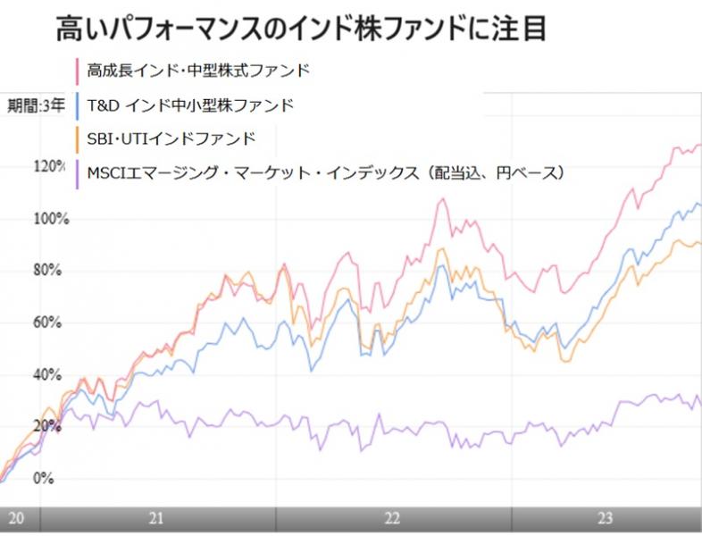 2024年1月にスタートする新NISAは、従来は5年(一般NISA)、20年(つみたてNISA)など期限が区切られていた非課税期間が撤廃され、生涯にわたって非課税運用が可能になる。新NISAによって10年、20年にわたる長期投資に相応しいファンドの選択が強まると考えられる。過去10年間の年率トータルリターンのランキング(純資産10億円以上、確定拠出年金・ラップ口座専用ファンドを除く、ETF含む、2023年9月末現在)のトップ10は、米国株を主たる投資対象としたファンドが5本で最も占有率が高いが、次に、インド株を主たる投資対象としたファンドが3本で続いている。残る2本は、半導体関連株に特化したファンドと日本小型株ファンドだ。米国に次ぐ高いリターンを記録したインド株ファンドに注目したい。 米国株でトップ10に入ったファンドは、「(NEXT FUND)NASDAQ100(為替ヘッジなし)連動型上場投信」(年率21.99%)、「アライアンスバーンスタイン・米国成長株投信Bコース(為替ヘッジなし)」(18.21%)、「netWIN GSテクノロジー株式ファンドB(為替ヘッジなし)」(17.99%)などだ。投資家の間でもテクノロジー関係のグロース株(成長株)が大きく値上がりしたという印象は定着し、そのため、米国株価指数「S&P500」連動型ファンドを使った積立投資の人気になっている。実際に、10年間の年率リターンが20%を超えると単純に計算しても基準価額が3倍以上に上昇することになる。10年で3倍以上とは非常に大きなリターンにつながった。 一方、インド株に投資するファンドでは、「高成長インド・中型株式ファンド」(18.58%)、「SBI・UTIインドファンド」(17.58%)、「T&Dインド中小型株ファンド(愛称:ガンジス)」(17.18%)の3本がトップ10にランキングされている。年率17%以上のリターンになった。近年、いわゆる「グローバルサウス」の代表国のように意識され、これからの経済成長や株高が期待される国にもなっている。 インド株への期待は、「高成長インド・中型株式ファンド」が純資産残高の急増によって9月8日から新規購入申し込みの受付を停止していることにも表れている。同ファンドには昨年から月次資金流出入が流入超過に転じ、今年5月以降は月次で100億円を超える流入額になった。8月には約281億円の資金流入額になっている。また、「高成長インド・中型株式ファンド(年1回決算型)」も同じように今年6月には約173億円の資金流入となり、9月には約256億円と大きな資金が流入した。そもそも信託金限度額が合計4000億円だったところ、急速な資金流入と基準価額の上昇によって9月1日現在の純資産残高の合計が約3703億円になったため、新規購入の申し込みをストップした。運用資産の状況等を勘案しながら、新規購入受付再開を判断するとしている。 また、「SBI・UTIインドファンド」は、昨年10月から月次の資金流出入が流入超過に転じたものの、月次の資金流入額は10億円前後で安定している。純資産残高は約633億円で依然として拡大の余地が大きい。また、「T&Dインド中小型株ファンド」も昨年11月から資金流入に転じたが、こちらは月次の流入額が5億円を上回ってきたところで、純資産残高は約115億円とまだ小さい。両ファンドともに、アクティブファンドで、「SBI・UTIインドファンド」は大型株を含むインドの株式市場に上場している銘柄を広く投資対象として捉え、「T&Dインド中小型株ファンド」は中小型株を投資対象にしている。それぞれ、インド現地に調査ネットワークをもつ運用会社に実質的な運用をゆだねている。「SBI・UTIインドファンド」は、1963年にインドで最初に設立されたインド国内最古の投資信託運用会社のUTIグループに、「T&Dインド中小型株ファンド」はインベスコ・アセット・マネジメント(インド)プライベート・リミテッドが投資助言を行っている。 過去10年間で大きなリターンを残してきたファンドだが、米国は今後、景気が減速する方向にある。昨今の株式市場でも業績発表したハイテク・グロース企業の株価が、決算が予想に届かないために株価が大きく下落する銘柄が目立っている。一方、インドはIMF(国際通貨基金)の10月の経済成長率見通しでも2023年4月〜24年3月の経済成長率が従来の6.1%から6.3%に上方修正され、2024年度(24年4月〜25年3月)も6.3%の成長を予想している。世界全体の経済成長率予想が2023年3.0%、24年に2.9%と減速が予想される中で、インドの成長率は主要国の中で頭抜けた高成長が期待されている。こうした堅調な経済成長率に支えられ、インド株式市場への期待も高まっている。引き続き、インド株を主要投資対象としたファンドのパフォーマンスにも期待が持てるだろう。(グラフは、高いパフォーマンスで注目されるインド株ファンド)