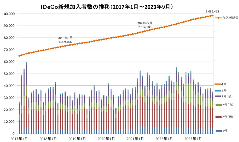 国民年金基金連合会が11月1日に発表したiDeCo(イデコ、個人型確定拠出年金)の業務状況によると9月の新規加入者数は3万5300人で加入者総数は308万9413人になった。新規加入者数は、2023年2月から8カ月連続で前年同月比割れになっている。22年10月の制度改正によって加入が簡素化された「企業年金あり」の加入者が激増した影響が落ち着いてきたといえる。なお、従業員のiDeCoに企業が上乗せ拠出をするiDeCo+(イデコプラス:中小事業主掛金納付制度)は、実施事業所数は6688事業所、対象従業員数は4万2822人になった。実施事業所数、対象従業員数ともに前年同期比30%を超える増加率になっているが、この伸び率も月を追うごとに鈍化してきた。 9月の新規加入者の内訳は、第1号加入者は4526人(前月4512人)、第2号加入者は2万8747人(前月3万1610人)、第3号加入者は1689人(前月1587人)となった。第2号加入者の総数が3万人を下回ったのは今年5月以来、4カ月ぶりのこと。第2号加入者の中で、企業年金なしの新規加入者が1万6873人(前月1万8134人)。共済組合員(公務員)の新規加入者は5570人(前月6348人)となった。第2号加入者の中で「企業年金あり」が6304人(前月7128人)と前年同月比24%増だった。 iDeCo+は、従業員のiDeCoの掛金に、企業が掛け金を上乗せ拠出する仕組み。企業年金を実施していない従業員数300人以下の企業が導入できる。従業員のiDeCo掛金は、原則として給与天引きとし、その掛金に事業主が上乗せ拠出した分をまとめてiDeCo実施機関である国民年金基金連合会に納付する仕組みになっている。従業員の掛金と事業主掛金の合計額は月額5000円以上2万3000円以下の範囲でそれぞれ1000円単位で設定することが可能になっている。企業年金は、長期化する退職後の暮らしをサポートする重要なツールとして従業員確保のために導入機運が高まってきているが、中小企業では企業型DC(確定拠出年金)、あるいは、DB(確定給付型企業年金)ともに、自社単独で導入するのはハードルが高いが、iDeCo+は比較的容易に導入することができる。 iDeCo+は2018年5月から事業主掛金の上乗せが可能となった。当初は従業員数100人以下の事業者が対象だったが、2020年10月に従業員要件が300人以下に拡大された。2022年2月頃までは、実施企業数が4000社程度、対象従業員数も2万5000人程度だったため、前年同月比で50%増程度の増勢で拡大していたが、2022年後半になって実施企業数が5000社を超えたあたりから、前年同月比での伸び率が徐々に鈍化し始め、遂には前年同月比30%増程度にまで伸び率が鈍化した。ベースとなる実施企業数や対象従業員数が大きくなってきたため、伸び率が鈍化したという側面もあるが、2022年頃は毎月150社程度が新規に制度を導入していたことと比較すると、2023年に入ってからは月間の新規導入社数が100〜130社程度になっている。 総務省・経済産業省が実施した経済センサスー活動調査によると2021年6月調査で、全国の法人数は約178万社。うち、従業員数が300人以下の企業は約176万社で、全法人数の99%を占めている。これに対し、現在のiDeCo+実施企業数は6688社にとどまるため、実施率は対象企業の0.4%にも満たない。まだまだiDeCo+の認知度は低く、今後の拡大余地は大きい。 そもそもiDeCoの加入者総数309万人にしても、加入対象者6756万人の4.6%に過ぎない。iDeCo+は、従業員がiDeCoに加入することも促す制度であるため、iDeCo+の拡大によって、iDeCoの加入者増にも弾みがつくことになる。様々な機会を通じてiDeCo+について情報が拡散されることが望まれる。(グラフはiDeCo新規加入者数の推移)