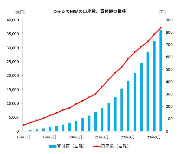 金融庁が先日公表した「NISA・ジュニアNISA口座の利用状況調査(2023年6月末時点)」によると、つみたてNISAの口座数及び口座における買付額ともに、前四半期比での増加が続いた。金融庁は四半期ごとにNISAの開設・利用状況調査を実施している。 2023年6月末時点の口座数は、一般NISAが約1106万口座(23年3月末比1.4%増)、つみたてNISAが約836万口座(同6.7%増)となった。買付額は、一般NISAが約29兆1139億円(同2.7%増)、つみたてNISAが約3兆6380億円(同12.3%増)となった。 2022年6月末時点との比較では、口座数が一般NISAで3.9%増、つみたてNISAは30.9%増、買付額は一般NISAで12.3%増、つみたてNISAが72.8%増となった。 つみたてNISA対象ファンドは現時点で、「指定インデックス投資信託」211本、「指定インデックス投資信託以外の投資信託(アクティブ運用投資信託等)」38本、ETF8本(米国籍1本含む)の合計257本となっている。