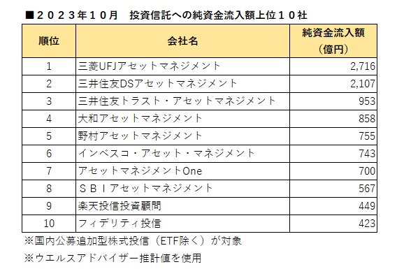 2023年10月の運用会社別の国内公募追加型株式投信(ETF除く)への純資金流入額(ウエルスアドバイザー推計値使用)上位10社を見たところ、三菱UFJアセットマネジメントが2716億円の純資金流入で5カ月連続のトップとなった。以下、三井住友DSアセットマネジメントが2107億円の純資金流入で2カ月連続の2位となり、3位には、953億円の純資金流入で前月の13位から大きく順位を上げた三井住友トラスト・アセットマネジメントが入った。 三菱UFJアセットは引き続き低コストのインデックスファンドがけん引役となった。「eMAXIS Slim米国株式(S&P500)」は858億円の純資金流入で全個別ファンド中で純資金流入額第2位、「eMAXIS Slim全世界株式(オール・カントリー)」は827億円の純資金流入で同第3位となった(※三菱UFJアセットマネジメントは2023年10月1日付で三菱UFJ国際投信から商号変更した)。 三井住友DSアセットは、10月23日に運用を開始した「ドナルド・スミス米国ディープバリュー株式Bコース(為替ヘッジなし)」が438億円の純資金流入となり、個別全ファンドで第6位となった。同ファンドは実質的に、米国上場企業の中から、その本源的価値と比べて極めて割安で投資魅力度が高いと判断した企業の株式に投資する。実質的な運用は、バリュー株式運用を専門とする米独立系運用会社のドナルド・スミス・アンド・カンパニーが行う。なお、「Aコース(為替ヘッジあり)」の純資金流入額は20億円であった。Aコース、Bコースともに野村證券が販売している。 三井住友トラスト・アセットは、「外国債券SMTBセレクション(SMA専用)」などファンドラップ専用ファンドへの純資金流入が寄与した。確定拠出年金専用及びファンドラップ専用を除く一般の投資家が購入可能なファンドでは、「NWQフレキシブル・インカムファンド 為替ヘッジなし(毎月決算型)」が約43億円の純資金流入となった。
