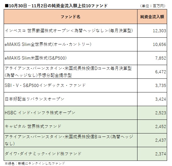 国内公募追加型株式投信(確定拠出年金専用、ファンドラップ専用、及びETF除く)を対象として、ウエルスアドバイザー推計値に基づいて先週(2023年10月30日−11月2日)の純資金流入額上位10ファンドを確認したところ、「インベスコ 世界厳選株式オープン<為替ヘッジなし>(毎月決算型)」(愛称:世界のベスト)が2週ぶりのトップとなったほか、「HSBC インド・インフラ株式オープン」など4ファンドが新規にランクインした。 「インベスコ 世界厳選株式オープン<為替ヘッジなし>(毎月決算型)」の純資金流入額は123億円。先々週(10月23−27日)の2位からランクアップし、10月16−20日以来のトップとなった。同ファンドのほかには、「eMAXIS Slim全世界株式(オール・カントリー)」、「eMAXIS Slim米国株式(S&P500)」、「アライアンス・バーンスタイン・米国成長株投信Dコース毎月決算型(為替ヘッジなし)予想分配金提示型」、「SBI・V・S&P500インデックス・ファンド」(愛称:SBI・V・S&P500)、「日本好配当リバランスオープン」が先々週に続いてトップ10内となった。 先週新たにランクインしたのは、「HSBC インド・インフラ株式オープン」、「キャピタル 世界株式ファンド」、「アライアンス・バーンスタイン・米国成長株投信Bコース(為替ヘッジなし)」、「ダイワ・ダイナミック・インド株ファンド」。「ダイワ・ダイナミック・インド株ファンド」は10月16―20日以来、「キャピタル 世界株式ファンド」は6月12−16日以来のランクイン。「HSBC インド・インフラ株式オープン」と「アライアンス・バーンスタイン・米国成長株投信Bコース(為替ヘッジなし)」は今年初めてのランクインとなった。 「HSBC インド・インフラ株式オープン」は実質的に、インドのインフラ関連企業の株式に投資する。インドのインフラ関連企業とは、インド国内のインフラ関連企業、もしくはインドのインフラに関連し、収益のかなりの部分をインド国内の活動から得ているインド以外の国の企業を指す。 「アライアンス・バーンスタイン・米国成長株投信Bコース(為替ヘッジなし)」は実質的に、成長の可能性が高いと判断した米国企業の株式に投資する。企業のファンダメンタルズ分析と株価バリュエーションに基づいて銘柄を選択する。 一方、先々週トップ10入りしていたファンドのうち、「ドナルド・スミス米国ディープバリュー株式ファンドBコース(為替ヘッジなし)」、「日経225ノーロードオープン」、「楽天 日本株4.3倍ブル」、「SBI 日本株4.3ブル」がトップ10圏外となった。