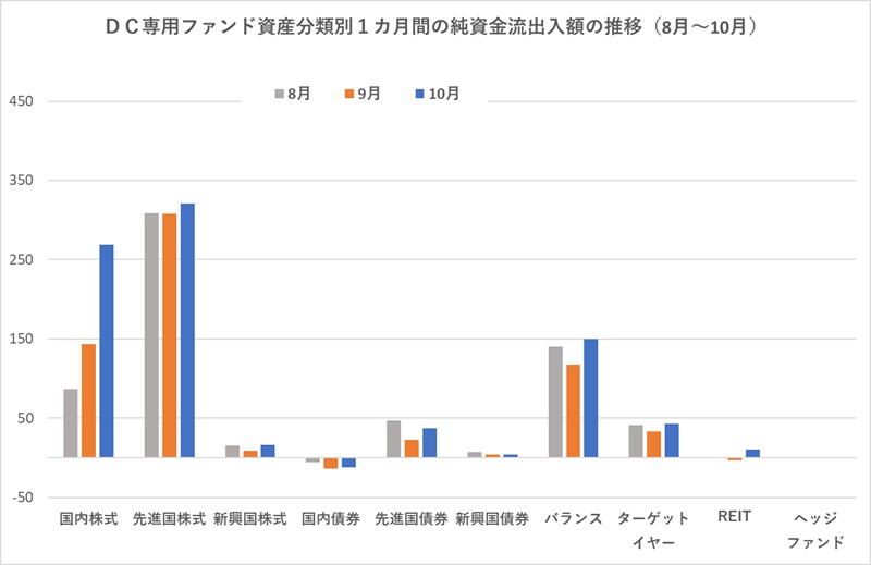 DC専用ファンドの2023年10月の純資金流出入額(速報値)は約837億円の資金流入超過になった。資金流入超過は2020年12月以降35カ月連続になった。流入額のトップは前月と同様に「先進国株式」で資金流入額は前月の約308億円から約321億円と横ばいだった。次いで、「国内株式」の流入額が約144億円から約269億円に拡大した。「国内株式」に250億円を超える資金が月次で流入するのは2015年1月以来初めて。また、「バランス」も資金流入額が約149億円と安定的な資金流入だった。一方、「国内債券」は約12億円の流出超で3カ月連続の資金流出になった。前月まで6カ月連続資金流出だった「REIT」は約10億円の資金流入に転じた。 DC専用ファンド全体の純資産総額は約10兆8452億円と前月から約2028億円減少した。2カ月連続で純資産総額が減少した。10月は指数ベースで米S&P500が前月比2.20%マイナスと3カ月連続で下落し、日欧に加え中国の株価も下落するなど、世界的な株安になった。残高の内訳は、株式ファンド51%、債券ファンド14%、バランスファンド34%という割合で、前月と同じだった。 (※個別のDC規約では、DC専用ファンド以外のファンドを制度に採用している場合があるため、DC専用ファンド全体の純資産総額は、国内DC制度全体で運用されているファンドの残高とは一致しない) ■資金流入額ランキングのトップは「野村 外国株式インデックスF(確定拠出年金)」 DC専用ファンドの過去1カ月間の純資金流入額ランキングのトップは、5カ月連続で「野村 外国株式インデックスファンド・MSCI−KOKUSAI(確定拠出年金向け)」だった。第2位には前月同様に「野村DC外国株式インデックスファンド・MSCI−KOKUSAI」、第3位には「One DC国内株式インデックスファンド」が入った。前月第3位だった「三井住友・DC外国株式インデックスファンドS」は4位に後退した。先進国株式インデックスファンドがランキングの上位を席巻する中で、国内株式インデックスファンドが割って入った格好だ。 トップ10のうち、7本を先進国株式インデックスに連動するインデックスファンドが占め、残る3本が国内株式(TOPIX連動型)のインデックスファンドだった。 DC(確定拠出年金)市場では、特に、企業型DCにおいて掛金を企業が拠出するという仕組みになっているため、加入者である従業員がDC資産残高の変化をチェックするということが少ない傾向にある。このため、一度投資先を指定してしまうと、そのまま何年も同じファンドに継続投資するという傾向が強い。結果的に、その選択したファンドが長期的に値上がりする資産であれば、その投資行動は問題ない。現在の先進国株式インデックスファンドへの資金流入は、ここ数年の間、米国株式をはじめとした先進国株式のパフォーマンスが優れていたことの反映といえる。 一方、国内株式については、今年に入ってから長年劣後してきた米国株式のリターンを上回るような成績を示し始めている。今後、国内株式への資金流入が定着するためには、国内株式市場の安定的な好パフォーマンスが続くことがポイントになるだろう。今後の推移を見守りたい。 ■トータルリターンのトップ10は国内株バリューファンド 個別ファンドの過去1年間のトータルリターンランキングトップは、前月はトップ10圏外(82位)だった「クスリのアオキホールディングス株式F」だった。前月の1位だった「DCトヨタ自動車/トヨタグループ株式ファンド」は第5位に後退した。個別の株式や企業グループに限定したファンドは、個別企業の株価動向の影響を強く受けることになるため、順位の変動が激しい。ただ、日本株ファンドのパフォーマンスが相対的に良いため、外国株式ファンド等を押しのけて、トップ10に入ってきている。 このような個別企業グループのファンドを除くと、トップ10には、前月に続いて第2位の「三井住友・バリュー株式年金ファンド」、第3位の「DCダイワ 中小型株ファンド」、第4位の「MHAM 日本バリュー株オープン<DC年金>」、第6位の「DCファンダメンタルバリューF」、第7位「DCアクティブバリューオープン」、第10位「大和住銀DC日本バリュー株ファンド」など、バリュー(割安株)に着目したファンドがトップ10に6本ランクインしている。10月末時点で過去1年間のトータルリターンは、「TOPIX」が16.81%、「日経平均株価」が11.86%だが、ランキングに入っているバリュー株ファンドは25%を大幅に上回るパフォーマンスになっている。(グラフは、過去3カ月間のDC専用ファンドの資産クラス別資金流出入の状況)