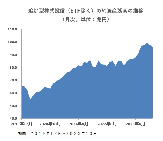 2023年10月末時点の国内公募追加型株式投信(ETF除く)の純資産総額は95兆7765億円となった。9月末比では2兆89億円減。今年8月末にピークとなる99兆1693億円となったあと、2か月連続の減少となった。 ウエルスアドバイザーの独自集計では、10月の国内公募追加型株式投信(ETF除く)への純資金流入額は1兆1800億円となった。2か月連続で1兆円超の流入超過と高水準の純資金流入が続いている。資金流入が続く中でも、世界的な株式や債券の値下がりにより、純資産残高は減少した。10月の日経平均株価は月間で3.14%、NYダウは同1.36%の下落となった。ニューヨーク債券市場では、10年物国債利回りが9月末の4.577%から10月末には4.932%まで上昇(債券価格は下落)し、国内債券市場では新発10年物国債利回りが同0.765%から0.950%まで上昇した。