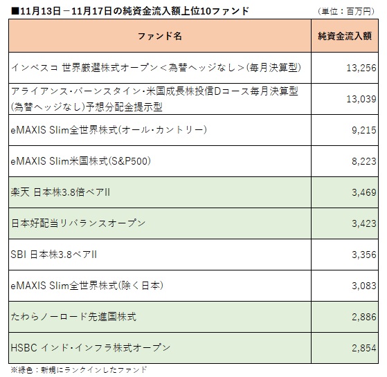 国内公募追加型株式投信(確定拠出年金専用、ファンドラップ専用、及びETF除く)を対象として、ウエルスアドバイザー推計値に基づいて先週(2023年11月13−17日)の純資金流入額上位10ファンドを確認したところ、「インベスコ 世界厳選株式オープン<為替ヘッジなし>(毎月決算型)」(愛称:世界のベスト)が2週ぶりにトップとなったほか、4ファンドがトップ10内に返り咲いた。 「インベスコ 世界厳選株式オープン<為替ヘッジなし>(毎月決算型)」の純資金流入額は約133億円。先々週(11月6−10日)の4位からランクアップし、10月30日−11月2日以来のトップとなった。同ファンドのほかには、「アライアンス・バーンスタイン・米国成長株投信Dコース毎月決算型(為替ヘッジなし)予想分配金提示型」、「eMAXIS Slim全世界株式(オール・カントリー)」、「eMAXIS Slim米国株式(S&P500)」、「SBI 日本株3.8ベアII」、「eMAXIS Slim全世界株式(除く日本)」が先々週に続いてトップ10内となった。 先週新たにランクインしたのは、「楽天 日本株3.8倍ベアII」、「日本好配当リバランスオープン」、「たわらノーロード先進国株式」、「HSBC インド・インフラ株式オープン」。「楽天 日本株3.8倍ベアII」は5月15−19日以来約半年ぶり、「たわらノーロード先進国株式」は10月16−20日以来、「日本好配当リバランスオープン」と「HSBC インド・インフラ株式オープン」は10月30日−11月2日以来のランクインとなった。 一方、先々週トップ10入りしていたファンドのうち、「楽天・全米株式インデックス・ファンド」(愛称:楽天・VTI)、「SBI・V・S&P500インデックス・ファンド」(愛称:SBI・V・S&P500)、「楽天・全世界株式インデックス・ファンド」(愛称:楽天・VT)、「eMAXIS Slim先進国株式インデックス」がトップ10圏外となった。