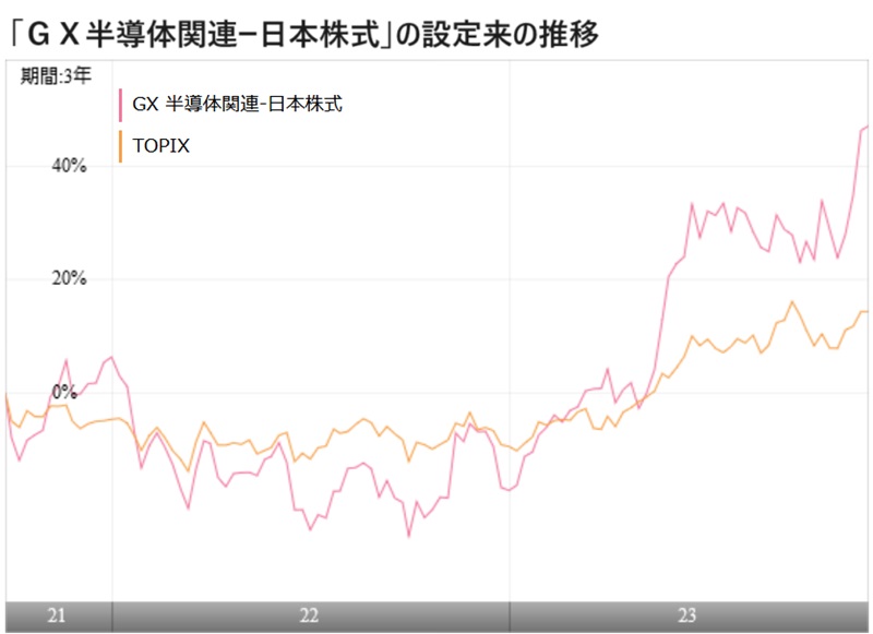 2024年末に生産を開始する予定で建設が進む半導体製造最大手TSMC(台湾セミコンダクター)の熊本工場、そして、2025年4月の稼働をめざす国内企業が出資した半導体会社「ラピダス」の北海道工場など、日本の半導体関連産業に大きな動きが続いている。これを投資機会として国内の半導体関連企業に投資する新ファンド「ジャパン半導体株式ファンド」が12月22日に新規設定される。日本の半導体産業に絞って投資するETFが2021年9月に設定された「GX 半導体関連−日本株式」(コード番号:2644)は、10月末現在で過去1年間のトータルリターンが43.67%と「国内大型グロース」カテゴリーでトップの運用成績になっている。このETFの勢いを追いかける運用成績が残せるのか、設定後のパフォーマンスが期待される。 新ファンド「ジャパン半導体株式ファンド」は、「半導体製造装置や半導体材料の供給を行なう企業」、「半導体の製造にかかわる企業」、「半導体産業の発展から恩恵を受ける周辺企業」の3つのカテゴリーを投資対象とする。運用方針として「半導体産業の中長期的な需要の移り変わりや技術の進化に目を配り、産業構造の変化を的確に捉えることで、成長企業を見極めます」と掲げており、現在の国内半導体産業の盛り上がりだけでなく、将来の産業構造の変化も捉えた中長期的な成長をめざすファンドだ。 日本政府は、半導体戦略の中心に国内の生産能力強化を据えており、足元で計画されている製造拠点の稼働によって、10年間でGDPが最大4.2兆円押し上げられると試算している。この後押しに、2022年度補正予算で「半導体サプライチェーンの強靭化支援」を目的に3686億円の予算を計上。また、「先端半導体の製造基盤整備」に4500億円、「次世代半導体の製造技術の確立など」のために4850億円と、合計で約1.3兆円の支援策を決定している。 また、TSMCが数ある候補地の中から日本に工場建設を決定したように、日本企業が世界に誇る半導体製造装置や半導体材料は日本での半導体製造のモチベーションにもなっている。台湾に集中している半導体工場を分散化させるという地政学的な意味合いでも、今後、TSMCに次ぐ半導体製造大手の日本進出の期待も強い。 そもそも半導体は、様々な産業のデジタル化を支え、デジタル化が加速する社会において必要不可欠なものとなっている。世界の半導体市場は、スマートフォンやPC、データセンターなどに加え、電気自動車や生成AI(人工知能)といったイノベーションの拡がりによって、中長期的に成長が加速すると見込まれている。また、コロナ禍を受けた深刻な半導体不足を経て、半導体は国の安全保障を左右する戦略物資にも位置付けられるようになってきている。かつて、日本が半導体産業で世界のリーダーだった時代があったが、今、改めて日本の技術力に世界の目が向いている状況といえるだろう。 先行して設定されたETF「GX 半導体関連−日本株式」は、半導体産業に関連する国内上場株式を構成銘柄とする「FactSet Japan Semiconductor Index」に連動する投資成果を目指す。2021年9月の設定で、2022年は世界的な利上げ等の影響でグロース株(成長株)に逆風となる環境だったこともあって、年間でマイナス22.21%と低迷したが、2023年1−3月期で25.95%、同4−6月期で26.85%と大きく伸びた。同7−9月期こそマイナス4.06%と一服したものの、10月以降に再び上昇している。 このような半導体関連産業への成長期待は、グローバル市場でも顕著となっており、例えば、世界の半導体関連企業の株式に投資する「野村 世界業種別投資シリーズ(半導体) 」は、過去10年間のトータルリターン(年率)が23.25%と、先進国株式インデックス(MSCIワールド配当込み、円ベース)の同12.60%、米国「S&P500(配当込み、円ベース)」の15.79%を大きく上回る成果を上げている。今後、日本の半導体関連産業が世界的な注目を集める存在になっていくのであれば、過去10年以上にわたる世界の半導体産業の成長を、今後は日本の半導体関連産業が享受できるという期待も持てるところだ。もちろん、かつて隆盛を誇った日本の半導体産業が没落したように、変化の激しい半導体ニーズを的確に捉えて将来を見据えた投資計画を実行できるかどうかという経営力も問われる。そこには、企業を分析し、企業と対話をしながら投資対象銘柄を決定するアクティブファンドの力量によって企業を見極めることも重要になろう。新設される「ジャパン半導体株式ファンド」の目利きの力にも期待したい。(グラフは、「GX 半導体関連−日本株式」のパフォーマンス推移)