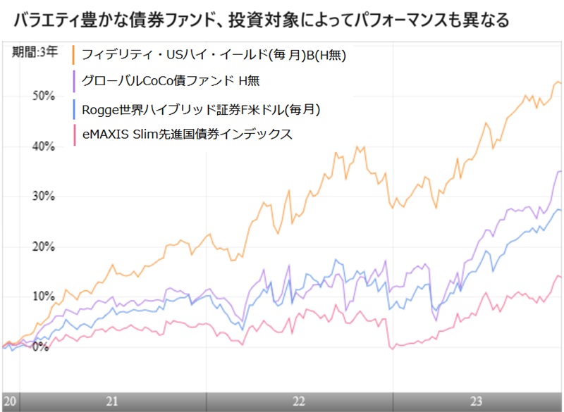 米FRBでタカ派の1人として知られるクリストファー・ウォラー理事が11月28日、FRBのこれまでのインフレ抑制策に自信を示し、「今後3カ月〜5カ月の間にインフレ鈍化が続くならば利下げ転換もあり得る」と発言したことで、米国の利上げに打ち止め感が強くなったばかりか、数カ月後の利下げ転換への期待もでてきた。米国は現在、政策金利であるFFレートを年5.25%〜5.50%の水準に誘導している。この水準は、22年ぶりの高水準であり、米国債券利回りは2007年以降の金融危機以来で最も高い水準になっている。今後に金利の低下(債券価格の上昇)が期待されるのであれば、現在の高い利回り水準は、米国債券投資にとって良い投資タイミングと考えられる。 債券運用大手のPIMCO社は、「野村PIMCO・世界インカム戦略ファンド」の最新のレポート(2023年11月20日付)で、「過去の利上げ局面では、米国の中長期金利は最後の利上げが実施されたタイミング辺りでピークをつけ、その後は低下に転じる傾向があります。結果、利上げ最終月からの投資は、高水準のインカム収入に加えて、金利低下に伴う債券価格の上昇も期待できます。実際に、米国における直近5回の利上げ最終月から1年間のリターンは平均で10.4%となり、投資開始時点の最終利回りを平均で4.2%上回るリターンとなりました」と、現状が債券投資には非常に魅力的なタイミングであることを強調している。 現在のグローバル債券ファンドのパフォーマンスを調べると、オーソドックスなインデックスファンドである「eMAXIS Slim先進国債券インデックス」の基準価額は、2022年12月末が1万1318円だったが、11月28日には1万2874円に上昇している。上昇率は大きくないが、2023年は概ね右肩上がりで基準価額が上昇してきた。同インデックスファンドの米国債券の組み入れ比率は約48%と半分近くになっている。今後、米国の金利が低下に転じる(米国債券の価格が底入れして上昇に転じる)のであれば、基準価額の一段の上昇が見込まれることになる。 また、より米国の債券に特化したファンドで「フィデリティ・USハイ・イールド・ファンド(毎月決算型)B(為替ヘッジなし)」では、22年12月末に3035円だった基準価額(分配金込み)が、3621円(同)まで上昇してきている。年初からの上昇率は19%を超えている。信用格付けが低く、利回りが高い債券に投資しているだけ、国債等の高格付け債券よりも高いリターンを稼げている。 債券ファンドには、様々なタイプの債券に投資するファンドがある。たとえば、「Rogge世界ハイブリッド証券F米ドル(毎月)」は、「世界の金融機関が発行するハイブリッド証券等(優先出資証券、劣後債等)に投資を行い、安定したインカムゲインの確保と中長期的な信託財産の成長を図ることを目指す」というファンドで、投資するファンドの格付は投資適格(BBB格)以上としているため、国債等よりも信用リスクはあるものの、ハイ・イールド債券よりも信用リスクは高い。 「グローバルCoCo債ファンド 為替ヘッジなし」はハイブリッド証券の一種であるCoCo債(Contingent Convertible Bonds=偶発転換社債)を中心に投資するファンド。CoCo債は、世界の大手銀行が中心となって発行しており、金融機関の自己資本比率が定められた水準を下回った場合などに元本の一部、または、全部が削減されたり、強制的に株式に転換されるなどの仕組みを組み込んだ債券になっている。このような条件が付いているため、CoCo債は、ハイブリッド証券の中でも利回りの水準が一段と高い債券になっている。 債券ファンドは、主に投資する債券の信用リスクによって期待できるリターンやリスクの大きさが異なる。過去のパフォーマンス等を手掛かりに、投資するファンドを研究したい。(グラフは、様々なタイプの債券ファンドのパフォーマンス)