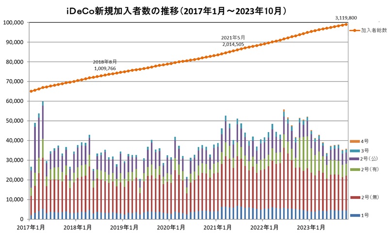 国民年金基金連合会が12月1日に発表したiDeCo(イデコ、個人型確定拠出年金)の業務状況によると10月の新規加入者数は3万5792人で加入者総数は311万9800人になった。10月の新規加入者数は前年同月比でマイナス30%になった。新規加入者数は、2023年2月から9カ月連続で前年同月比割れになっている。2024年1月からスタートする新NISAは非課税限度額が1人あたり1800万円に拡大し、同じように収益非課税で人気を集めてきたiDeCoの人気を奪っている。なお、従業員のiDeCoに企業が上乗せ拠出をするiDeCo+(イデコプラス:中小事業主掛金納付制度)は、実施事業所数は6841事業所、対象従業員数は4万3823人になった。 10月の新規加入者の内訳は、第1号加入者は4597人(前月4526人)、第2号加入者は2万9305人(前月2万8747人)、第3号加入者は1583人(前月1689人)となった。第2号加入者の中で、企業年金なしの新規加入者が1万7498人(前月1万6873人)。共済組合員(公務員)の新規加入者は5720人(前月5570人)となった。第2号加入者の中で「企業年金あり」が6087人(前月6304人)と前年同月比59.7%減だった。 2024年1月に始まる「新NISA」は、従来のNISA(少額投資非課税制度)の枠組みを大きく広げる。これまでは、一般NISAの非課税限度額は年間120万円で、期間が5年間の累計600万円。つみたてNISAは年間40万円で、期間20年間の累計800万円だった。一般NISAとつみたてNISAの併用はできなかったため、非課税で投資できる限度額は最大800万円でしかなかった。しかも、それは、積立投資で毎月3.3万円ずつ20年間にわたって継続した結果得られるというものだった。将来の資産を増やしたいと考える人々にとっては、非常に限られた資金枠でしかなかった。 このため、非課税で将来の資金を確保したいと考える人は、iDeCoを使って将来資金を積み増ししようと考えた。iDeCoの拠出限度額は企業型確定拠出年金等の加入状況によって異なるが、たとえば、会社に企業年金制度がない場合は、毎月2.3万円(年間27.6万円)まで非課税で積立ができ、しかも、掛金は所得から控除できるというメリットもある。かつ、60歳になるまで積立投資を継続できる。つみたてNISAで限度額いっぱいに積立投資をしても非課税枠が800万円では足りないと考えた場合に、iDeCoの活用は魅力的な手段になった。 しかし、NISAで1800万円まで非課税で将来資金が用意できるのであれば、わざわざiDeCoを使うまでもない。NISAの場合は、必要に応じて取り崩しもできるが、iDeCoは60歳になるまで換金できない仕組みだ。余裕資金で資産形成をしたいと考える人には、圧倒的に新NISAの方が使い勝手が良い。もっとも、「老後の資金こそ重要」と考え、「60歳まで換金できない」ことに価値を感じる人もいるだろう。そういう限られたニーズに応える制度として今後のiDeCoは活用されていくことになる。これまでのように、「NISAで足りない資金をiDeCoで補う」という使い方をされなくなる分、毎月の加入者数の伸びは限定的になるだろう。 一方、確定拠出年金制度は、企業型を中心に今後とも重要な年金準備ツールとして拡大していくものと考えられる。企業が従業員に対して掛金を拠出し、従業員の将来の年金を用意するという企業型確定拠出年金制度は拡大途上にある。iDeCoの枠組みを使った制度としては、従業員が加入するiDeCoに企業が上乗せ拠出するという仕組みの「iDeCo+」がある。iDeCo+は導入事業所数が6841事業所で4万人を超える従業員が対象になっているが、企業型確定拠出年金よりも導入のための手間が少ない制度でもあり、中小企業の間でもっと多くの制度採用が実施されることが期待されている。(グラフは、iDeCo新規加入者数の推移)
