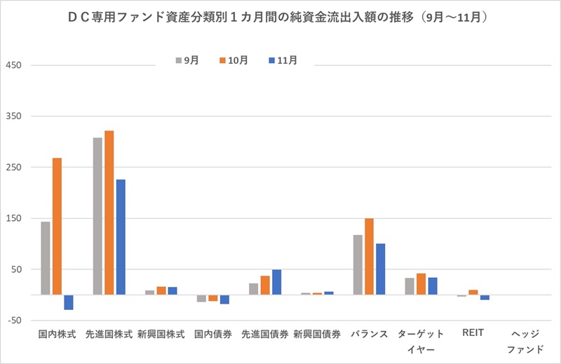 DC専用ファンドの2023年11月の純資金流出入額(速報値)は約375億円の資金流入超過になった。資金流入超過は2020年12月以降36カ月連続になった。流入額のトップは前月と同様に「先進国株式」だが、資金流入額は前月の約322億円から約226億円と減少した。次いで、「バランス」で流入額は前月の約150億円から約101億円になった。一方、前月は資金流入額で第2位だった「国内株式」は、約29億円の資金流出に転じた。また、「国内債券」は約17億円の流出超で4カ月連続の資金流出になった。 DC専用ファンド全体の純資産総額は約11兆4693億円と前月から約6241億円増加して過去最高を更新した。前月まで2カ月連続で純資産総額が減少していた。残高の内訳は、株式ファンド51%、債券ファンド13%、バランスファンド33%という割合で、前月と比較して債券ファンドとバランスファンドが1%ポイントずつ減少した。 (※個別のDC規約では、DC専用ファンド以外のファンドを制度に採用している場合があるため、DC専用ファンド全体の純資産総額は、国内DC制度全体で運用されているファンドの残高とは一致しない) ■資金流入額ランキングのトップは「野村 外国株式インデックスF(確定拠出年金)」 DC専用ファンドの過去1カ月間の純資金流入額ランキングのトップは、6カ月連続で「野村 外国株式インデックスファンド・MSCI−KOKUSAI(確定拠出年金向け)」だった。第2位には前月同様に「野村DC外国株式インデックスファンド・MSCI−KOKUSAI」、第3位には「三井住友・DC外国株式インデックスファンドS」だった。先進国株式インデックスファンドがトップ10ランキングの中に8本ランクインした。前月の7本から1本増えた。トップ10のうち、残る2本は、「三菱UFJプライムバランス(成長型)DC」と「DCダイワ外国債券インデックス」で、前月はトップ10に入っていた国内株式ファンドがトップ10から消えた。 国内株式については、日経平均株価の月次騰落率が5カ月ぶりにプラスになり、TOPIX(東証株価指数)も3カ月ぶりのプラスとなって、やれやれ売りが出たものと考えられる。日経平均株価は11月末時点で昨年末比プラス28.33%、TOPIXも同25.54%と短期間で大きく値上がりした後だけに、利益確定を急ぐ売りが出やすかったと考えられる。 ■トータルリターンの上位は国内株バリューだが外国株ファンドも台頭 個別ファンドの過去1年間のトータルリターンランキングトップは、前月は第5位だった「DCトヨタ自動車/トヨタグループ株式ファンド」になった。前月トップだった「クスリのアオキホールディングス株式F」は3位に後退した。前月に続いて第2位は「三井住友・バリュー株式年金ファンド」だった。 前月までは、トップ10を日本株ファンドが席巻していたが、今月は外国株ファンドが台頭している。第4位に「DC次世代通信関連 世界株式戦略ファンド」、第5位が「東京海上セレクション・外国株式」など、トップ10の半分を外国株式ファンドが占めるようになった。(グラフは、過去3カ月間のDC専用ファンドの資産クラス別資金流出入の状況)