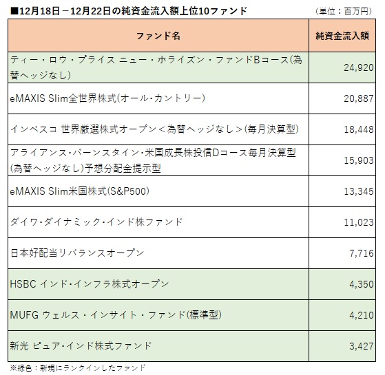 国内公募追加型株式投信(確定拠出年金専用、ファンドラップ専用、及びETF除く)を対象として、ウエルスアドバイザー推計値に基づいて先週(2023年12月18−22日)の純資金流入額上位10ファンドを確認したところ、20日設定の「ティー・ロウ・プライス ニュー・ホライズン・ファンドBコース(為替ヘッジなし)」がトップとなったほか、3ファンドが新たにトップ10入りした。 ティー・ロウ・プライス・ジャパンの「ティー・ロウ・プライス ニュー・ホライズン・ファンドBコース(為替ヘッジなし)」は約249億円の純資金流入となった。同ファンドは実質的に、成長性が高いと判断した米国小型企業の株式を主要投資対象とする。同ファンドのほかには、「HSBC インド・インフラ株式オープン」、「MUFG ウェルス・インサイト・ファンド(標準型)」、「新光 ピュア・インド株式ファンド」が新たにトップ10入りした。「HSBC インド・インフラ株式オープン」は11月20−24日以来、「新光 ピュア・インド株式ファンド」は8月21−25日以来、「MUFG ウェルス・インサイト・ファンド(標準型)」は今年初めてのランクインとなった。 先々週(12月11−15日)に続いてランクインしたのは、「eMAXIS Slim全世界株式(オール・カントリー)」、「インベスコ 世界厳選株式オープン<為替ヘッジなし>(毎月決算型)」(愛称:世界のベスト)、「アライアンス・バーンスタイン・米国成長株投信Dコース毎月決算型(為替ヘッジなし)予想分配金提示型」、「eMAXIS Slim米国株式(S&P500)」、「ダイワ・ダイナミック・インド株ファンド」、「日本好配当リバランスオープン」。 一方、先々週トップ10入りしていたファンドのうち、「SBI 日本高配当株式(分配)ファンド(年4回決算型)」(愛称:SBI日本シリーズ − 日本高配当株式(分配))、「楽天・全米株式インデックス・ファンド」(愛称:楽天・VTI)、「日経225ノーロードオープン」、「世界半導体関連フォーカスファンド」がトップ10圏外となった。