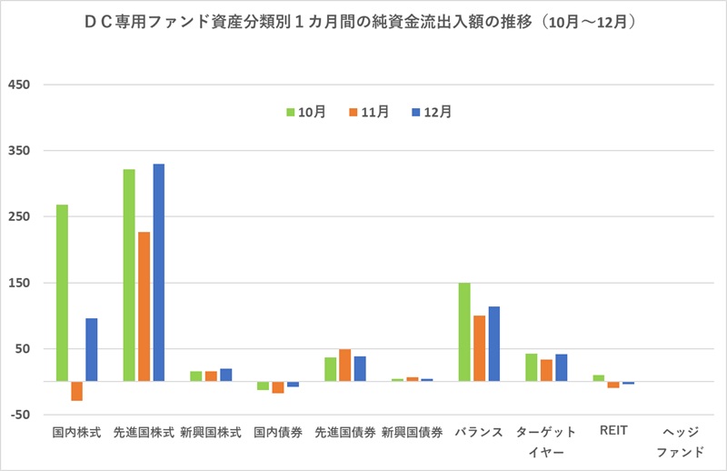DC専用ファンドの2023年12月の純資金流出入額(速報値)は約634億円の資金流入超過になった。資金流入超過は2020年12月以降37カ月連続になった。流入額のトップは前月と同様に「先進国株式」で資金流入額は前月の約227億円から約330億円と拡大した。次いで、「バランス」で、流入額は前月の約100億円から約114億円になった。一方、前月は資金流出だった「国内株式」は約96億円の資金流入に転じた。また、「国内債券」は約8億円の流出超で5カ月連続の資金流出になっている。 DC専用ファンド全体の純資産総額は約11兆6163億円と前月から約1470億円増加して前月に続いて過去最高を更新した。残高の内訳は、株式ファンド52%、債券ファンド13%、バランスファンド33%という割合で、前月と比較して株式ファンドが1%ポイント拡大した。 (※個別のDC規約では、DC専用ファンド以外のファンドを制度に採用している場合があるため、DC専用ファンド全体の純資産総額は、国内DC制度全体で運用されているファンドの残高とは一致しない) ■資金流入額のトップは「野村 外国株式インデックスF(確定拠出年金)」 DC専用ファンドの過去1カ月間の純資金流入額ランキングのトップは、7カ月連続で「野村 外国株式インデックスファンド・MSCI−KOKUSAI(確定拠出年金向け)」となり、純資産残高が6000億円の大台に達した。第2位には前月同様に「野村DC外国株式インデックスファンド・MSCI−KOKUSAI」、第3位には「三井住友・DC外国株式インデックスファンドS」とトップ3は変わらなかった。先進国株式インデックスファンドがトップ10ランキングの中に7本ランクインした。前月の8本から1本減った。 トップ10のうち、先進国株式インデックスファンド以外の3本は、第7位の「One DC国内株式インデックスファンド」、第9位の「みらいバランス・株式10(富士通企業年金基金DC向け)」、第10位の「DC世界経済インデックスファンド」だった。先進国インデックスファンドは、過去1年間のトータルリターンが32%を超える好調なパフォーマンスになっており、トップ10に割り込んだ3ファンドと比較して優位な成績が続いている。 ■トータルリターンのトップは「<DC>ベイリー・ギフォード世界長期成長株F」 個別ファンドの過去1年間のトータルリターンランキングトップは、「<DC>ベイリー・ギフォード世界長期成長株F」になった。前月トップだった「DCトヨタ自動車/トヨタグループ株式ファンド」は2位に後退した。第3位には「DC次世代通信関連 世界株式戦略ファンド」が入るなど、トップ10上位の顔ぶれが大きく変動した。 前月までは、国内株式ファンドがトップ10の半分を占めていたが、今月は第6位に「三井住友・バリュー株式年金ファンド」、第9位に「DCダイワ中小型株ファンド」と順位を落とし、第2位の「DCトヨタ自動車/トヨタグループ株式ファンド」と合わせて国内株式ファンドは3ファンドのみになった。(グラフは、過去3カ月間のDC専用ファンドの資産クラス別資金流出入の状況)